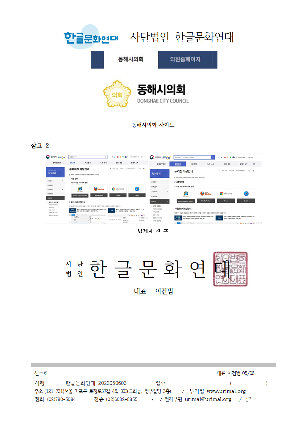 5. 이에 대한 동해시의회의 의견을 2022년 5월 20일까지 서면(urimal@urimal.org)으로 의견을 알려주시기 바랍니다. 고맙습니다.
