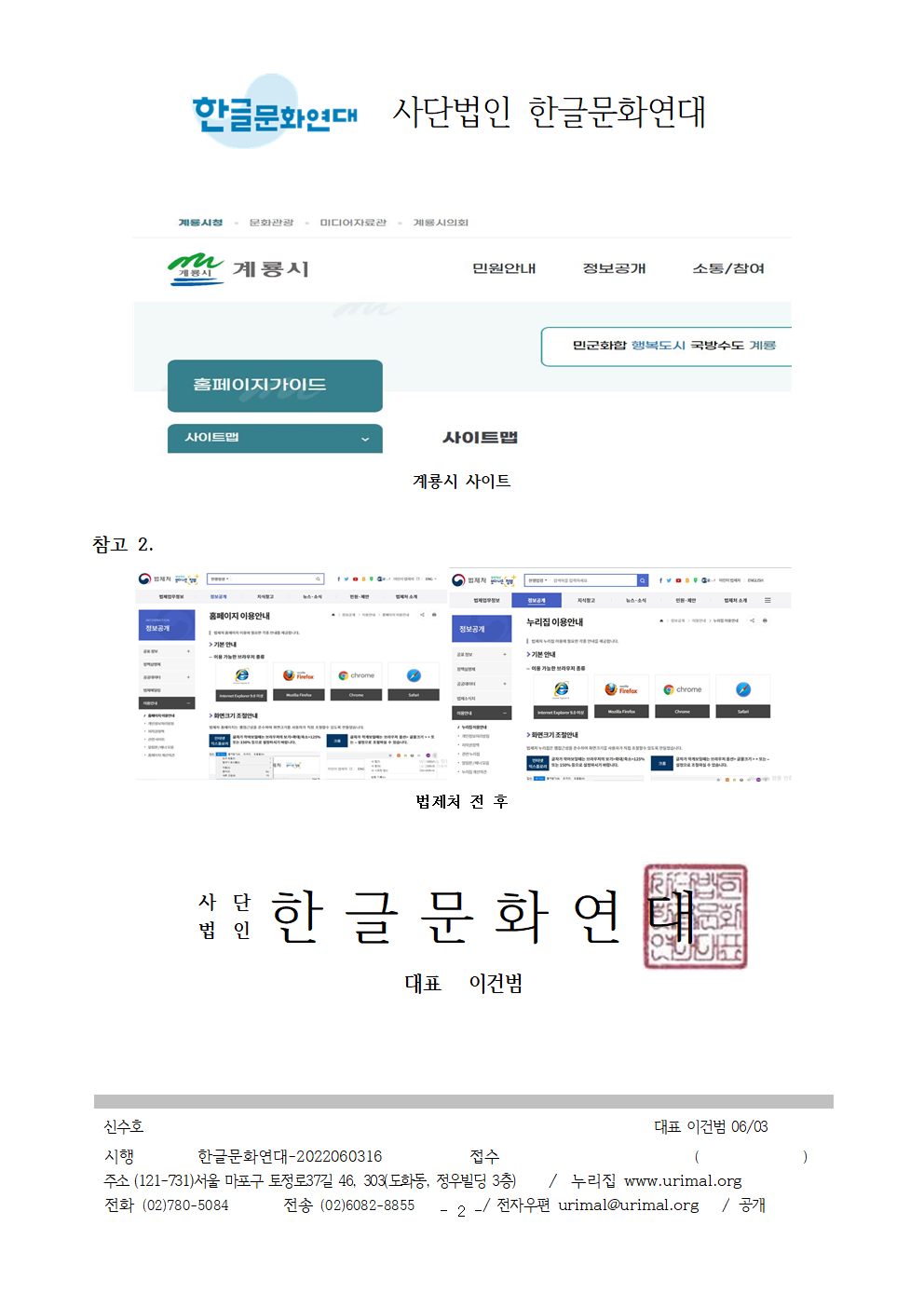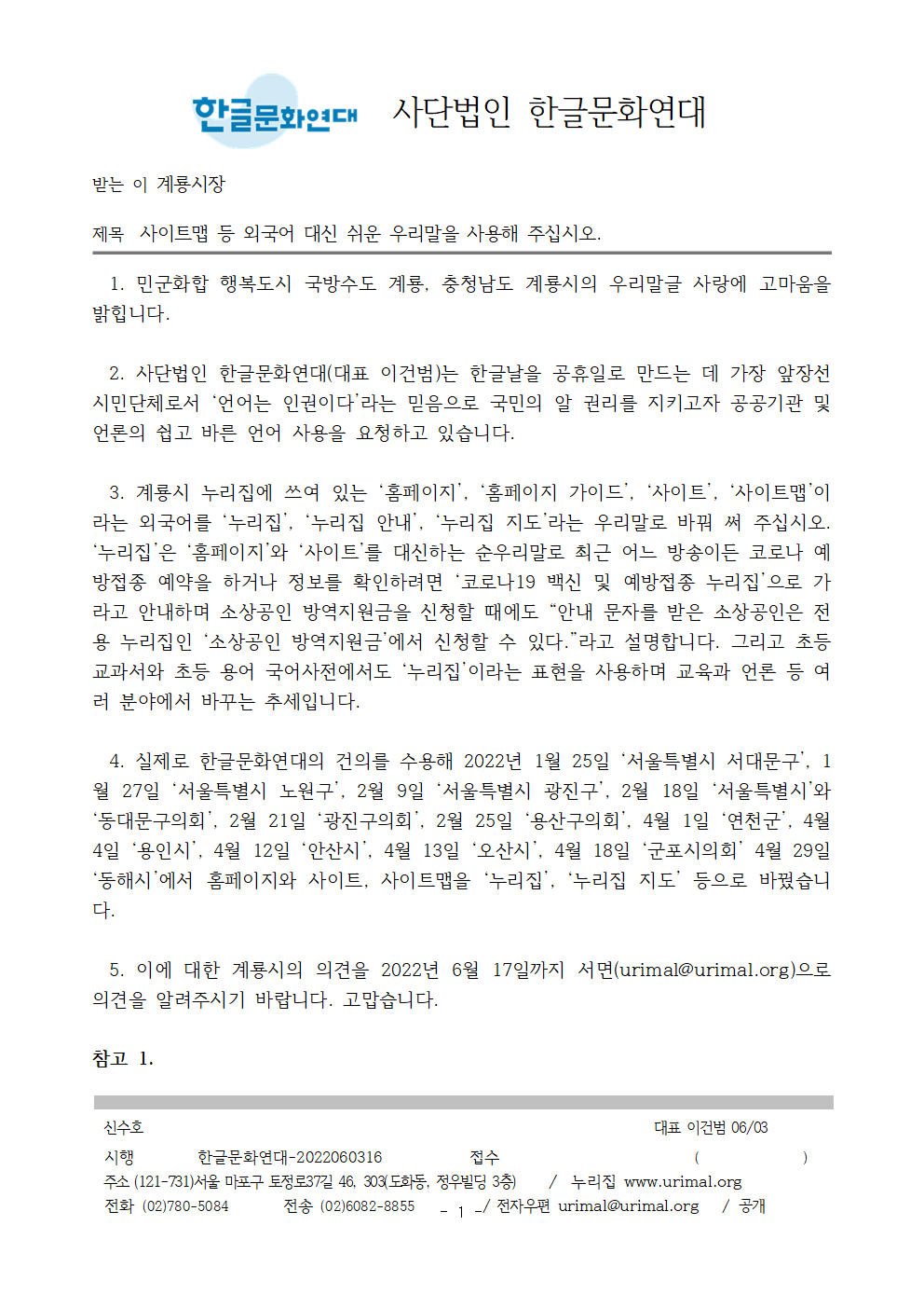 5. 이에 대한 계룡시의 의견을 2022년 6월 17일까지 서면(urimal@urimal.org)으로 의견을 알려주시기 바랍니다. 고맙습니다.