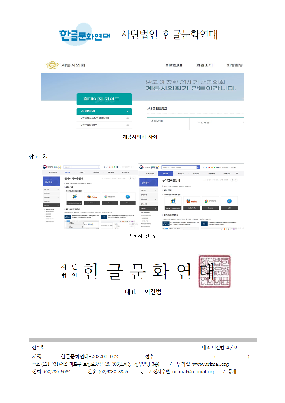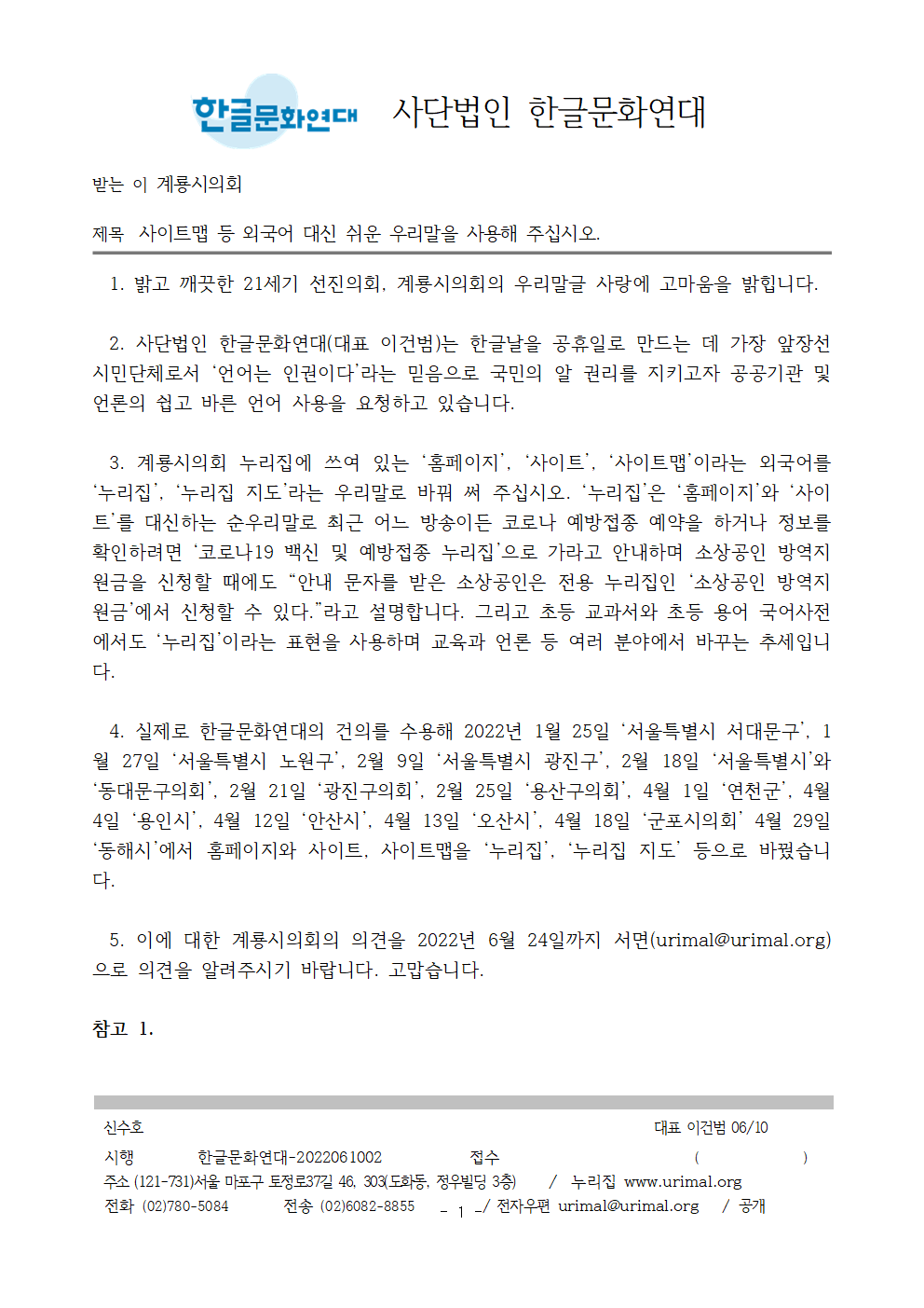 5. 이에 대한 계룡시의회의 의견을 2022년 6월 24일까지 서면(urimal@urimal.org)으로 의견을 알려주시기 바랍니다. 고맙습니다.