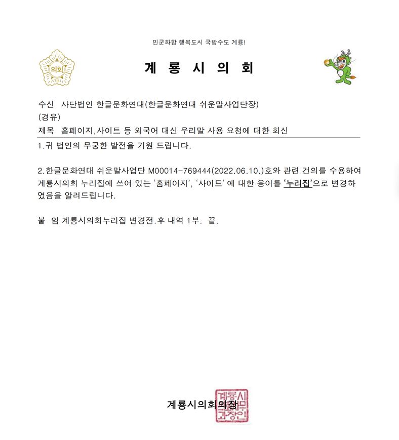 2.한글문화연대 쉬운말사업단 M00014-769444(2022.06.10.)호와 관련 건의를 수용하여 계룡시의회 누리집에 쓰여 있는 ‘홈페이지’, ‘사이트’ 에 대한 용어를 ‘누리집’으로 변경하 였음을 알려드립니다.