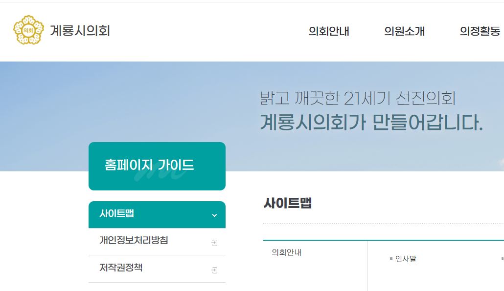 | [공문] 사이트맵 등 외국어 대신 쉬운 우리말을 사용해 주십시오. 계룡시의회 2022.06.10 (0) | 2022.06.29 |