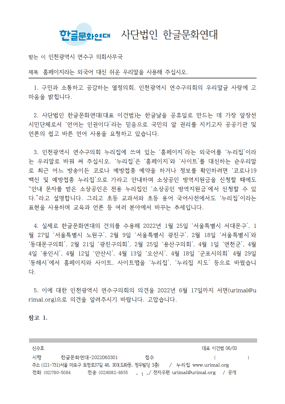 5. 이에 대한 인천광역시 연수구의회의 의견을 2022년 6월 17일까지 서면(urimal@urimal.org)으로 의견을 알려주시기 바랍니다. 고맙습니다.