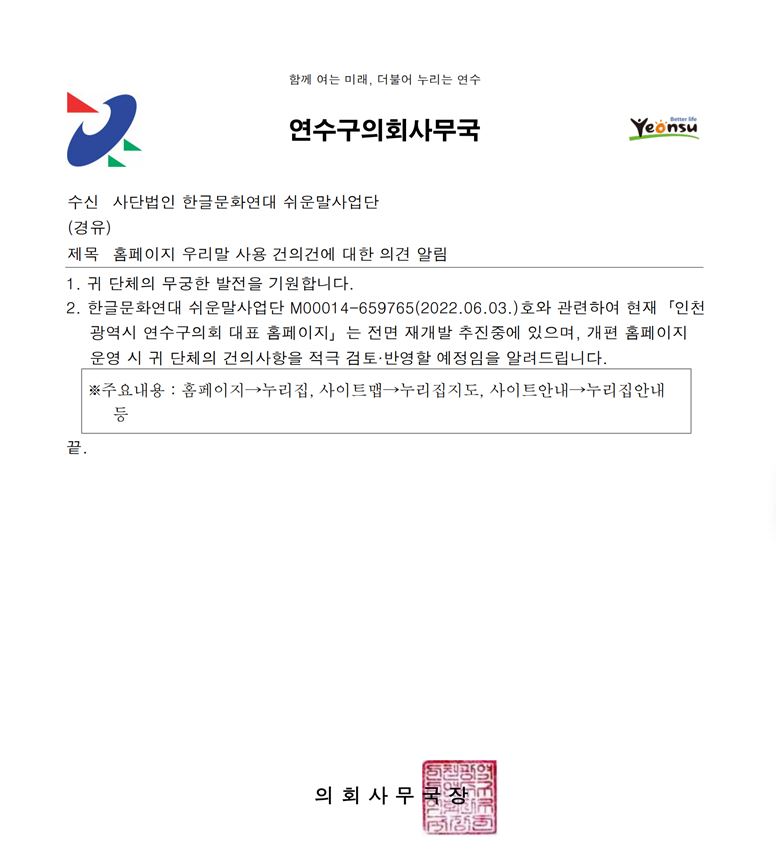 2. 한글문화연대 쉬운말사업단 M00014-659765(2022.06.03.)호와 관련하여 현재「인천 광역시 연수구의회 대표 홈페이지」는 전면 재개발 추진중에 있으며, 개편 홈페이지 운영 시 귀 단체의 건의사항을 적극 검토·반영할 예정임을 알려드립니다.