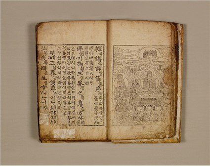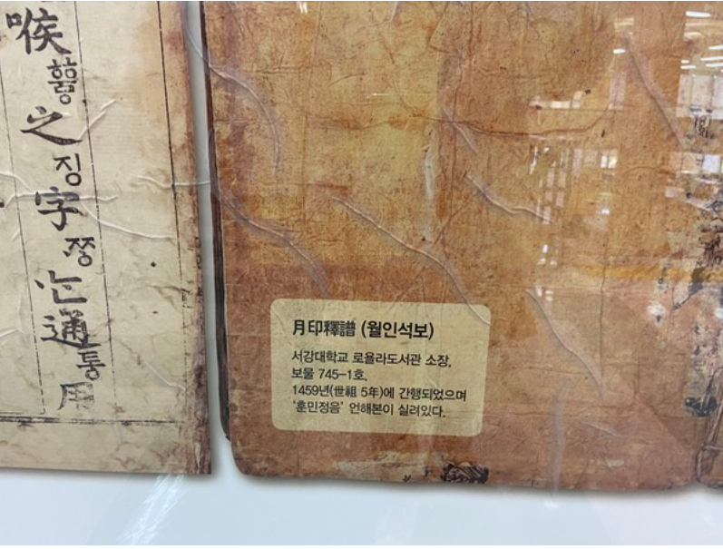 공부에 열중하고 있는 학생들이 가득한 서강대학교 로욜라도서관 1관 4층. 이곳의 한쪽 구석에는 ‘고서실’이라고 쓰인 작은 문이 있다. 중요한 자료들이 보관된 고서실에 일반 학부생이 출입하는 것은 원칙상 금지되어 있어 정확히 어떤 자료들이 있는지는 쉽게 알 수 없지만, 고서실 문 옆을 장식한 커다란 유리 간판은 이곳에 보관되어 있는 아주 중요한 기록 하나를 보여 준다. 바로 1459년 간행된 한글 고서이자 보물 745-1호인 『월인석보』 권1~2다.