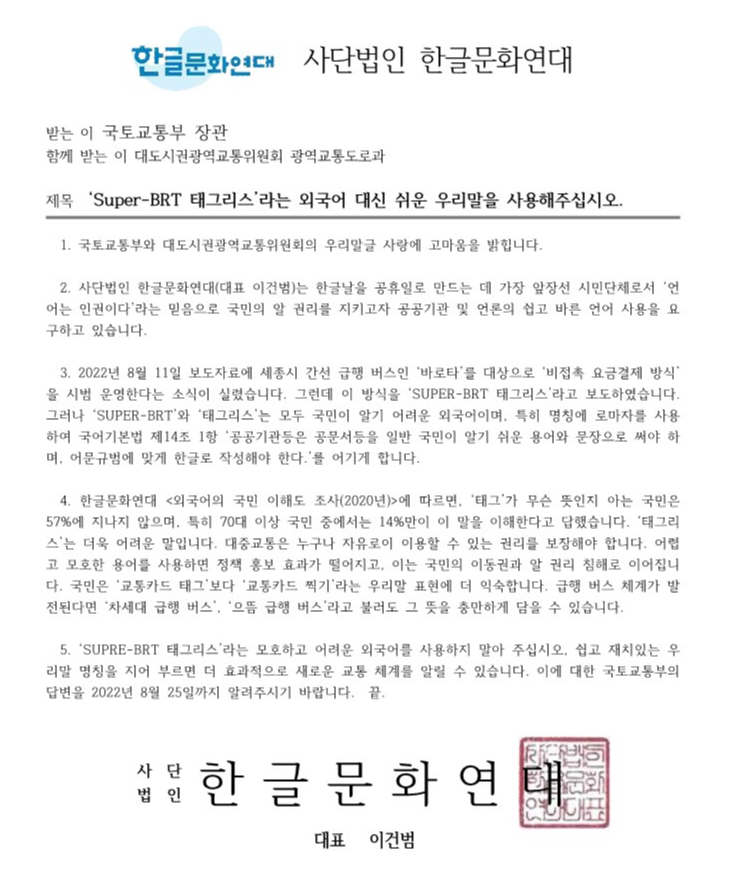 5. ‘SUPRE-BRT 태그리스’라는 모호하고 어려운 외국어를 사용하지 말아 주십시오, 쉽고 재치있는 우리말 명칭을 지어 부르면 더 효과적으로 새로운 교통 체계를 알릴 수 있습니다. 이에 대한 국토교통부의 답변을 2022년 8월 25일까지 알려주시기 바랍니다. 끝.