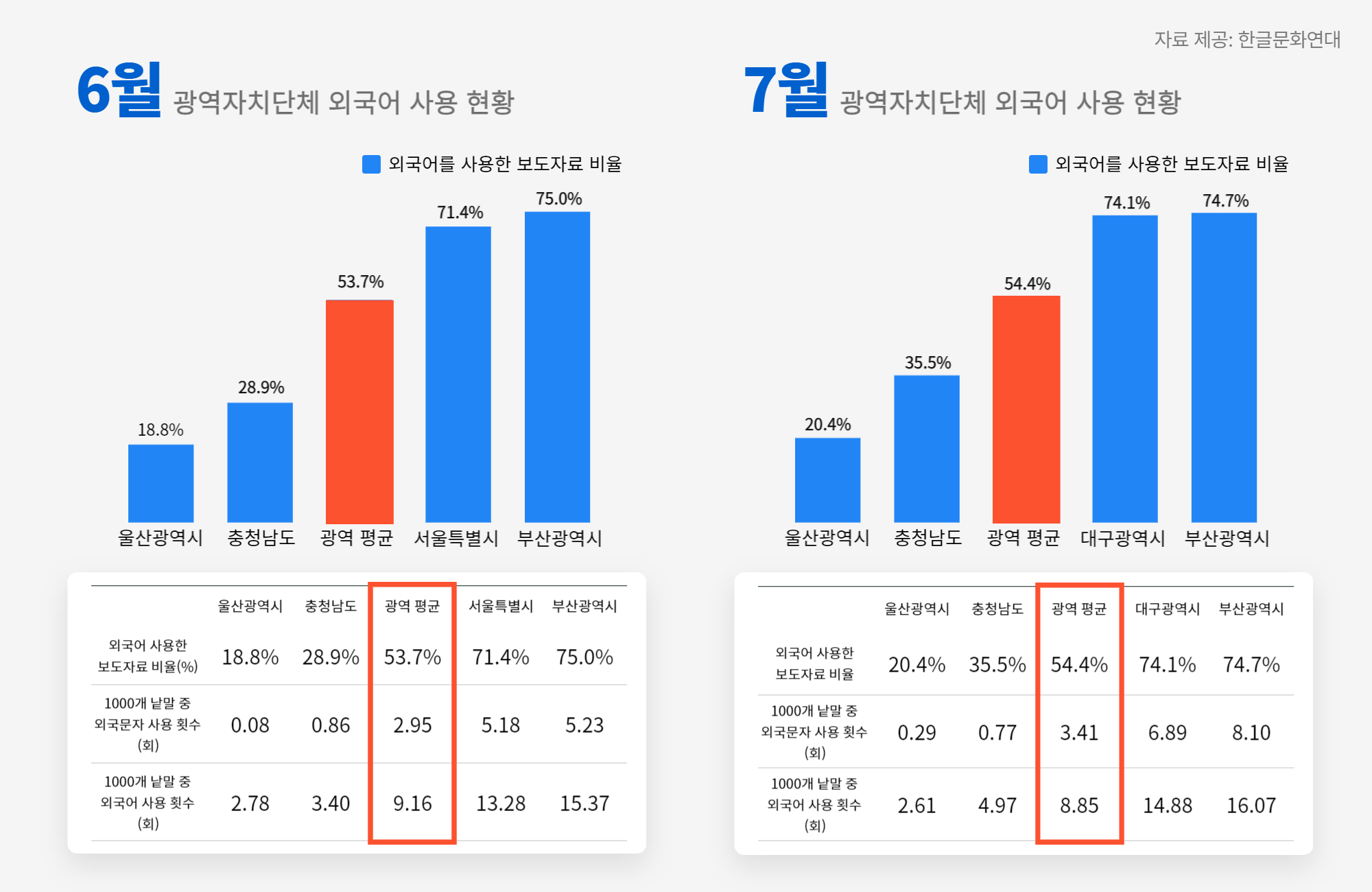 광역자치단체 가운데 울산광역시가 우리말과 한글을 제대로 살려 쓰는 데에 가장 앞장섰는데, 이는 6월과 7월 모두에서 그러하였다. 불필요하게 외국어 용어를 사용하고 외국 글자로 표기한 보도자료 비율이 가장 높은 광역자치단체는 부산이었고, 서울과 대구가 그 뒤를 이었다. 부산의 외국어 남용 보도자료 비율은 75%(6), 74.7%(7)로 그다음인 서울의 71.4%(6), 대구의 74.1%(7)보다 높았고, 외국어 남용이 가장 적은 울산의 18.8%(6), 20.4%(7)와 비교하면 매우 큰 차이가 난다.