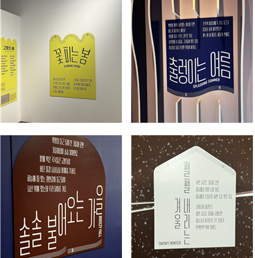 상설 전시가 한글에 대한 이해를 넓혀준다면, 기획 전시에서는 한글과 다양한 분야의 융합을 선보인다. 3층 기획전시실에서는 현재 <파란마음 하얀마음>이라는 제목의 동요 전시를 진행하고 있었다. 100번째 어린이날을 기념해 기획된 이 전시에서는 동요 노랫말에서 우리말의 묘미를 엿볼 수 있을 뿐 아니라 어른들의 마음에도 동심은 고스란히 남아 있다는 사실을 느낄 수 있었다. 기획 전시는 총 3부로 구성되어있다.