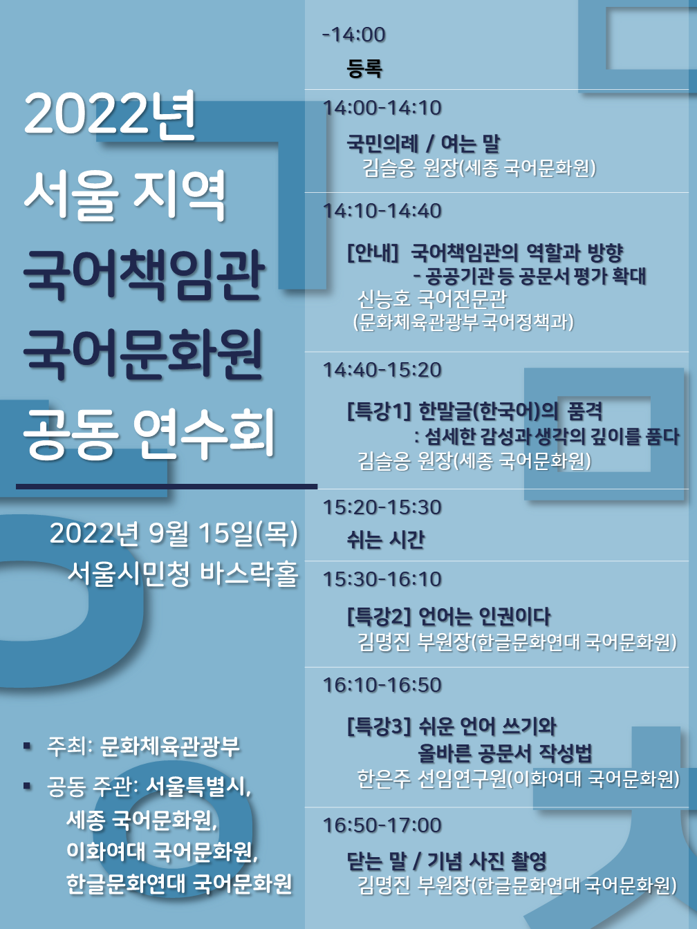 [알림] 로마자 약칭 대응 방안: 우리말 약칭 만들기 학술대회(12/2) / 2022 쉬운 우리말 쓰기, 공공언어 개선 학술대회 (2) | 2022.11.16 |