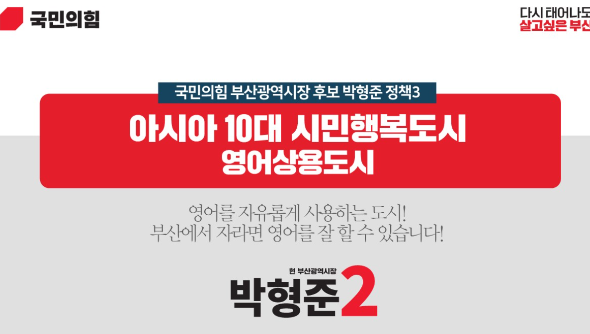 박형준 부산광역시장은 ‘아시아 10대 시민행복도시’ 선거 공약 중 하나로 ‘영어상용도시’를 내세웠다. 부산에 거주하면 누구나 영어를 잘하게 되는 영어친화적인 환경을 조성하겠다는 것이다. 영어상용도시는 영어로 소통이 원활한 환경을 구축하는 것을 의미한다. 영어 국제학교 설립을 확대하고 민간과 공공기관의 영어 상용 환경을 조성하며, 영어 신문 및 영어 방송을 강화하는 것이 구체적인 내용이다.