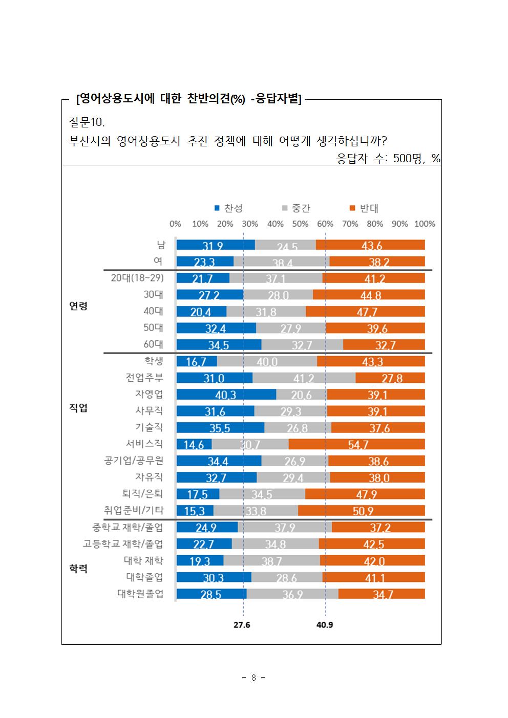 ‘부산시의 영어상용도시 추진정책’에 대한 시민들의 의견은 반대 40.9%(적극 반대 15.1%, 반대 25.8%), 찬성 27.6%(적극 찬성 3.9%, 찬성 23.7%)로 반대의견이 찬성 의견보다 높게 나타났다.