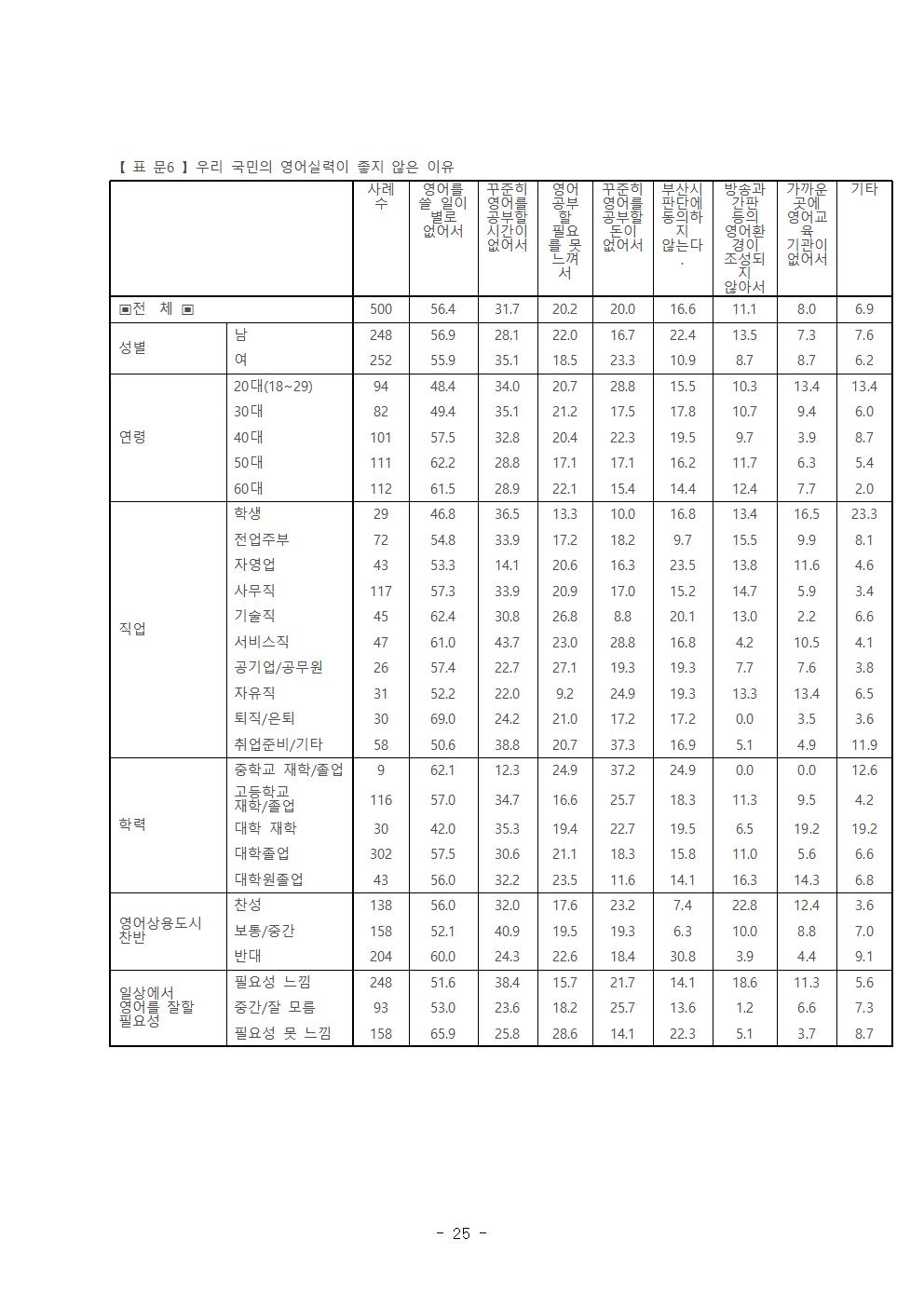 우리나라 국민의 영어 실력이 좋지 않은 것에 대한 이유로 ‘영어 쓸 일이 별로 없어서’라고 평가하는 응답이 56.4%로 나타났으며, 현실적으로 일상에서의 영어 사용 필요성이 없어 ‘시민들의 영어 상용’을 실현하는 것은 불가능할 것으로 판단된다. 한편, ‘가까운 곳에 영어 교육기관이 없어서’라는 응답은 8%로 나타났다. 이는 영어 교육기관의 존재가 영어 습득에 큰 영향을 미치는 요소가 아님을 가리킨다 하겠다.