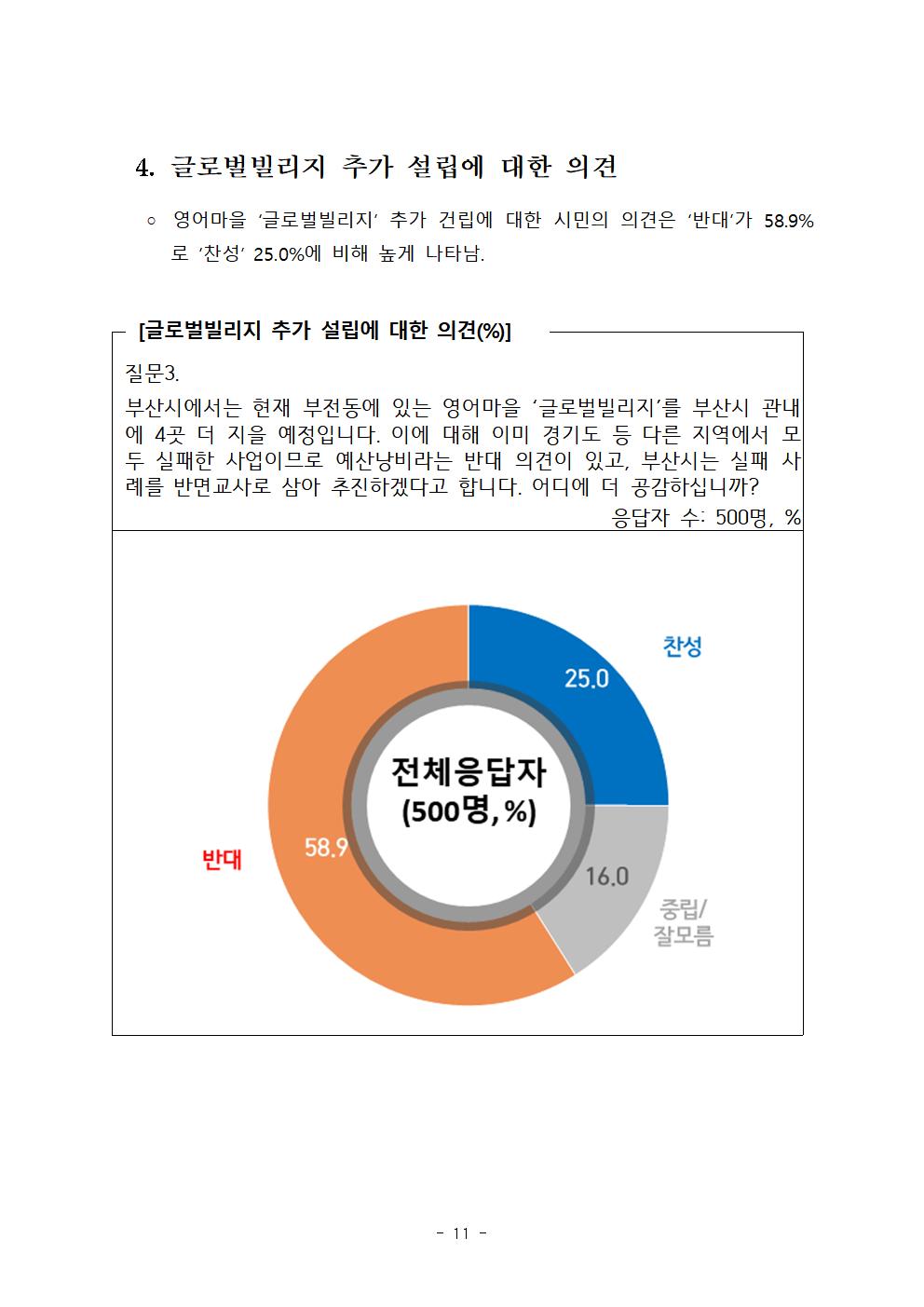 그리고 현재 부전동에 있는 영어마을 ‘글로벌빌리지’를 다른 곳에 추가 건립하는 것에 대해서 ‘반대’ 58.9%, ‘찬성’ 25.0%로 반대 의견이 찬성 의견보다 월등히 높았다. 이미 경기도 등 다른 지역에서 실패한 사업이라 이를 답습하여 영어마을을 추가로 설립하는 것은 예산 낭비에 그칠 뿐이라고 보는 시민들의 우려가 컸다.