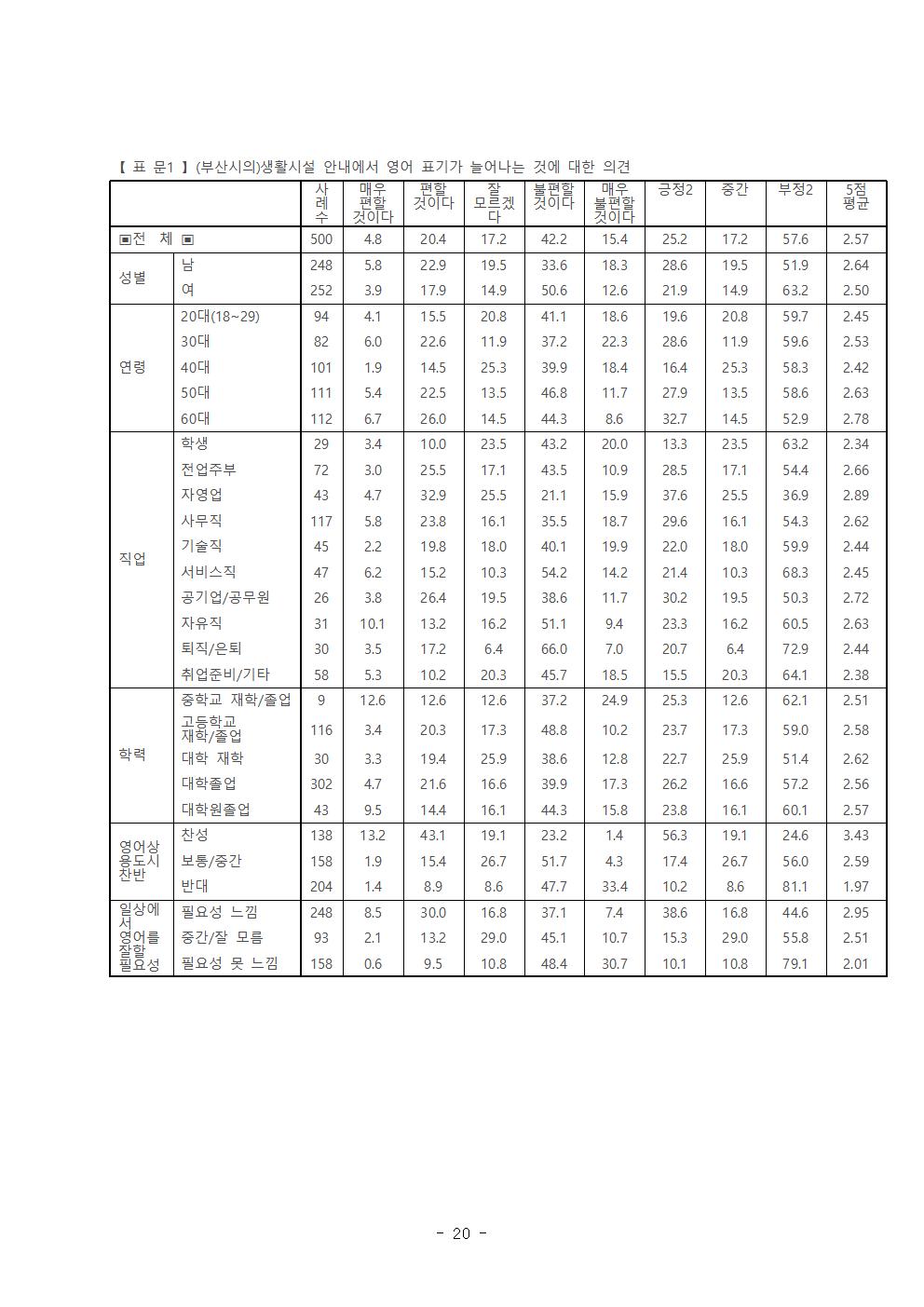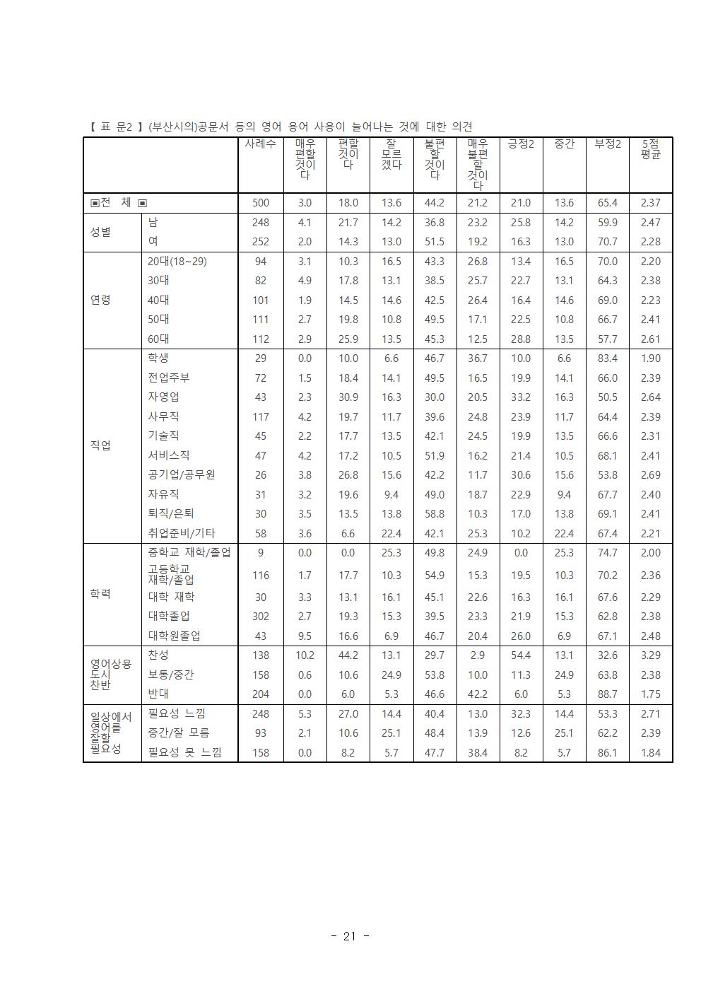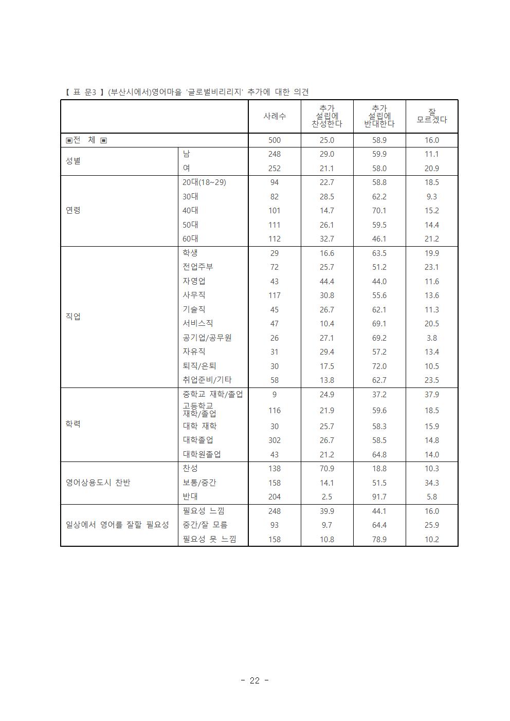 ‘부산시의 영어상용도시 추진정책’에 대한 시민들의 의견은 반대 40.9%(적극 반대 15.1%, 반대 25.8%), 찬성 27.6%(적극 찬성 3.9%, 찬성 23.7%)로 반대의견이 찬성 의견보다 높게 나타났다.