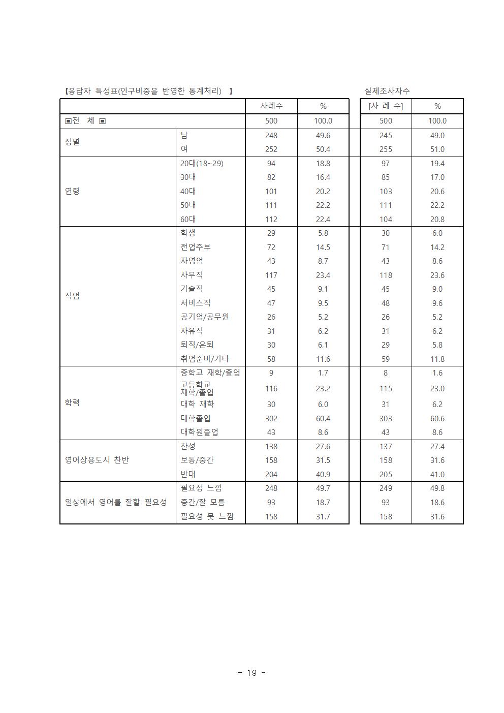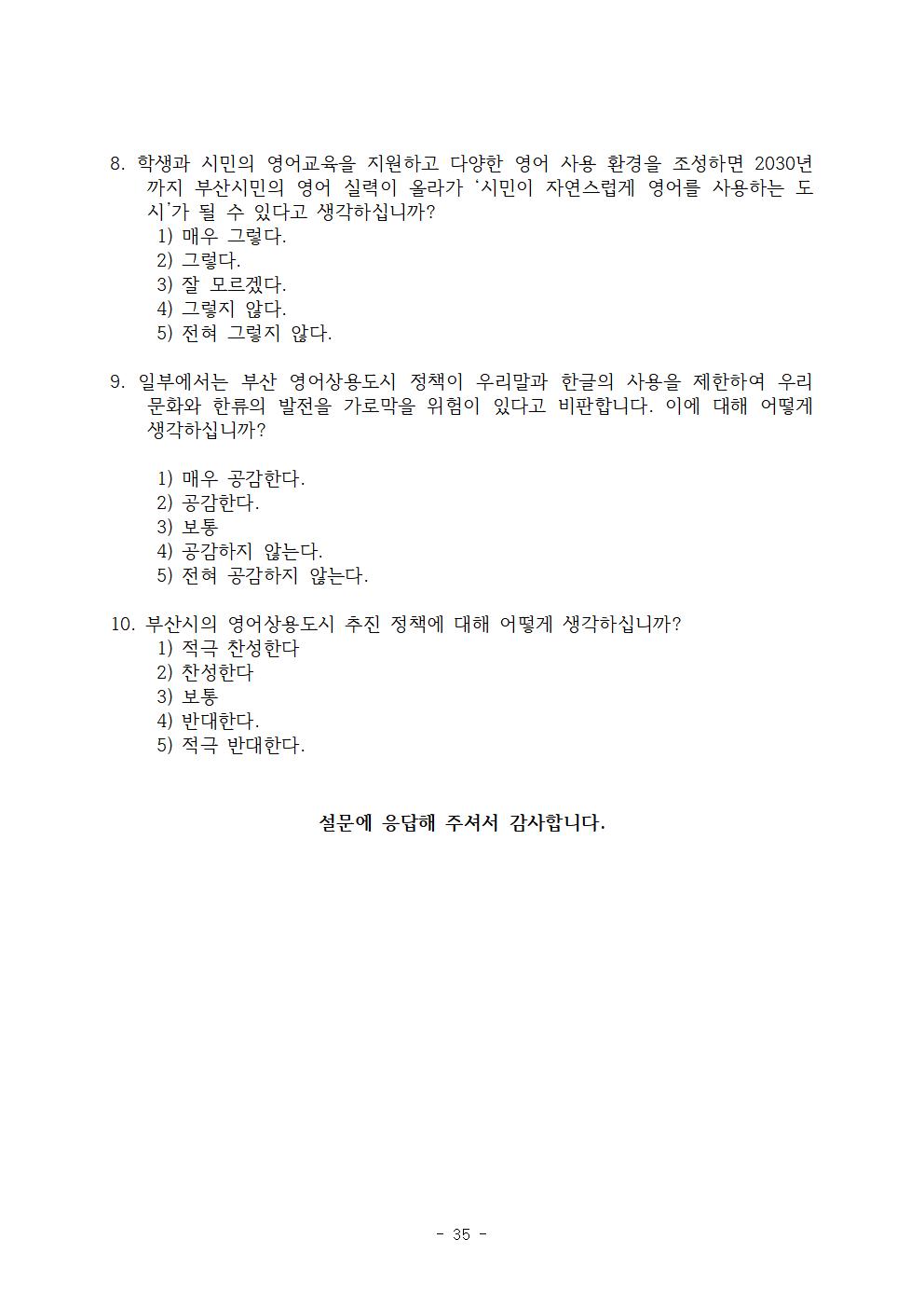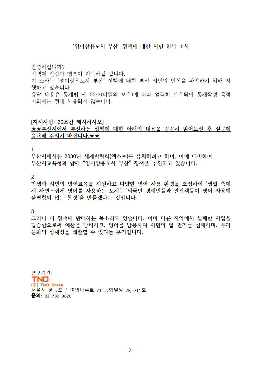 ‘부산시의 영어상용도시 추진정책’에 대한 시민들의 의견은 반대 40.9%(적극 반대 15.1%, 반대 25.8%), 찬성 27.6%(적극 찬성 3.9%, 찬성 23.7%)로 반대의견이 찬성 의견보다 높게 나타났다.