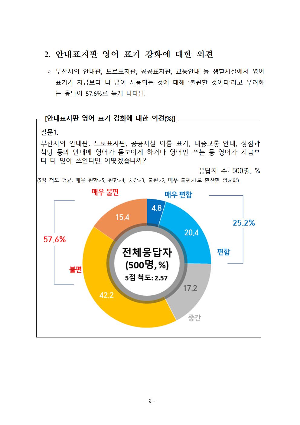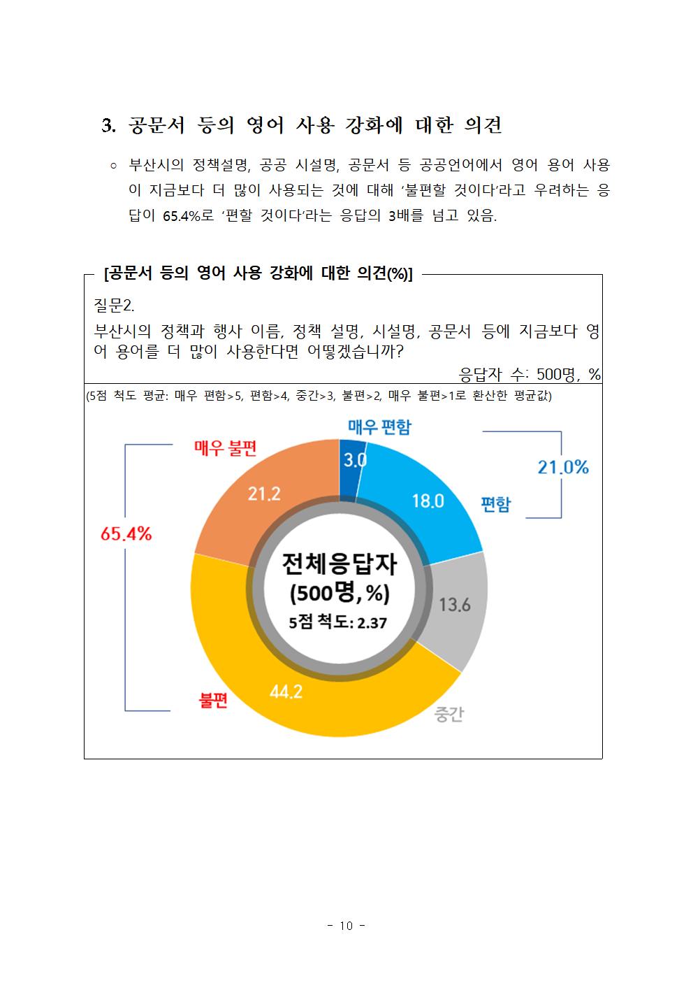 특히, 부산시에서 내세운 영어상용도시 4대 전략 가운데 ‘공공부문이 선도하는 영어상용도시’ 전략에 따라 공문서와 정책 및 행사 이름 등에 영어가 많이 쓰이면 ‘불편하다’는 응답이 65.4%로 압도적이었다. 또한 ‘영어상용도시 인프라와 환경 조성’ 전략에 따라 시내의 안내표지판이나 공공시설 이름 표기 등 영어 환경을 많이 조성하면 ‘불편하다’라는 의견이 57.6%로 높게 나타났다. 따라서 이 두 가지 사업이 실행된다면 시민의 기본적인 알 권리를 침해할 가능성이 커질 것으로 예상된다.