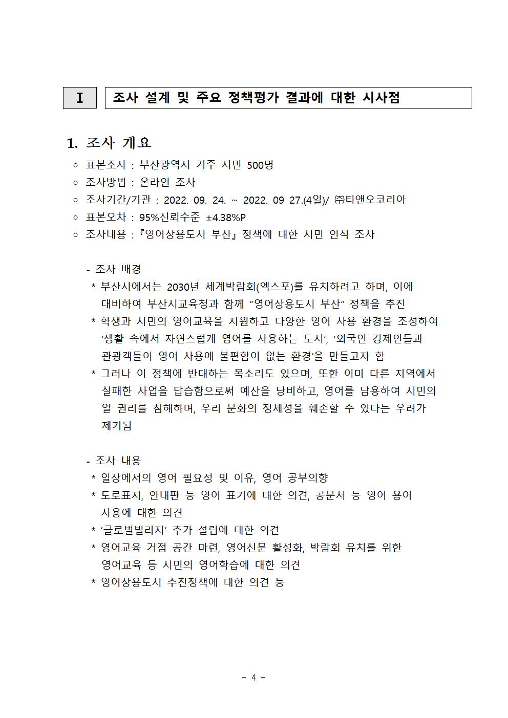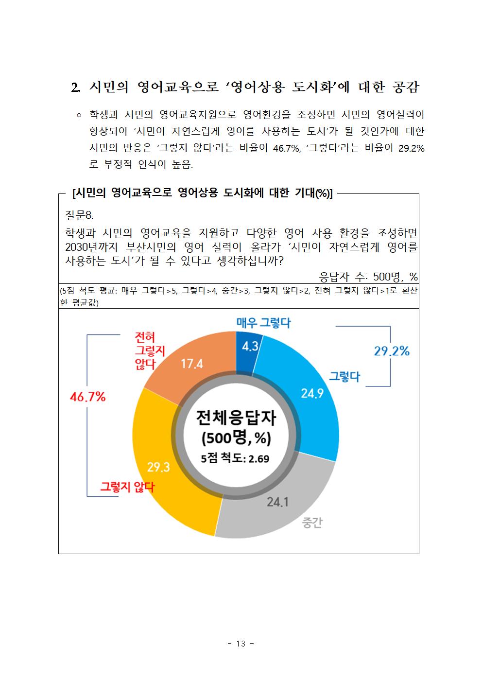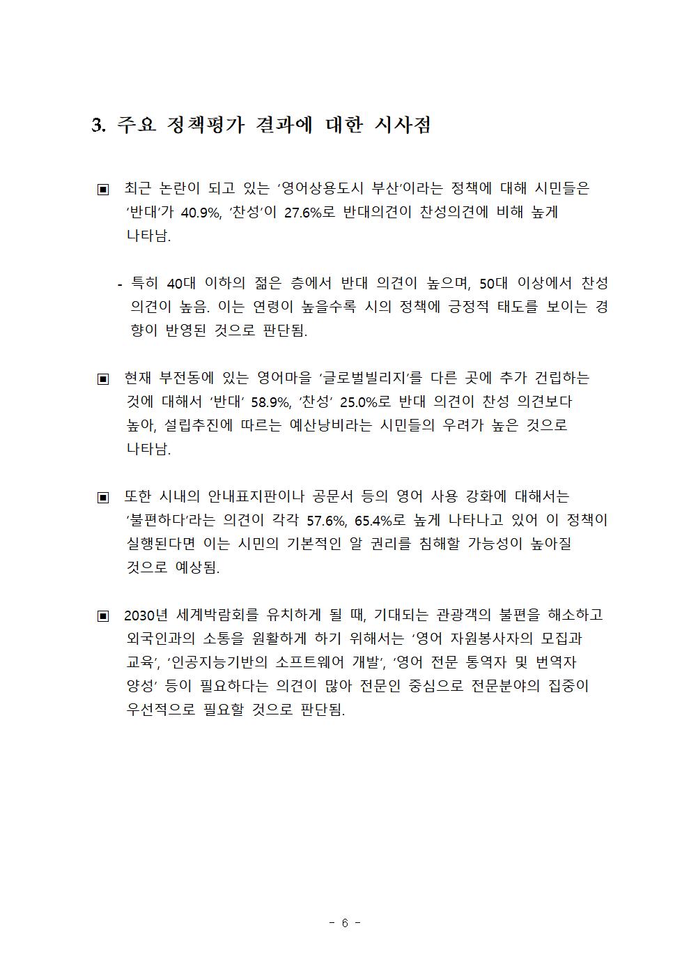 전반적으로, ‘영어상용도시 부산’ 정책에 대한 시민들의 평가는 반대의견이 월등하게 높았다.