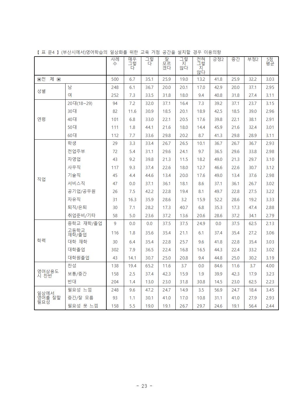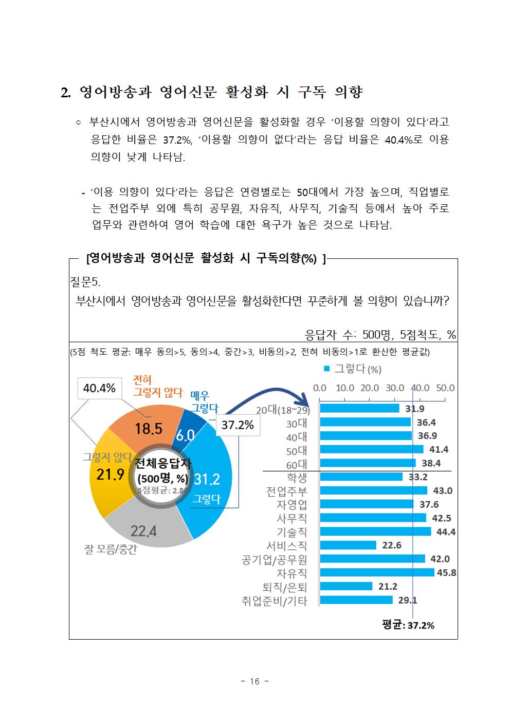 부산시에서 영어방송과 영어신문을 활성화할 경우 ‘이용할 의향이 있다’라고 응답한 비율은 37.2%, ‘이용할 의향이 없다’라는 응답 비율은 40.4%로 이용 의향이 낮게 나타났다. ‘이용 의향이 있다’라는 응답은 연령별로는 50대에서 가장 높으며, 직업별로는 전업주부 외에 특히 공무원, 자유직, 사무직, 기술직 등에서 높아 주로 업무와 관련하여 영어학습에 대한 욕구가 높은 것으로 나타났다.