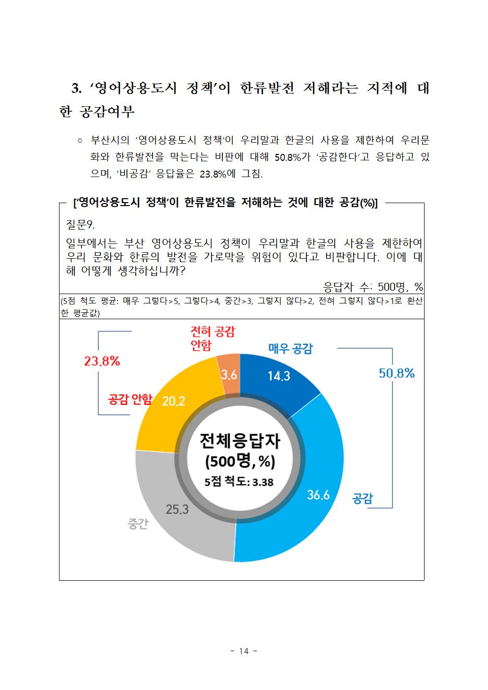 부산시의 ‘영어상용도시 정책’이 우리말과 한글의 사용을 제한하여 우리 문화와 한류 발전을 막는다는 비판에 대해 ‘공감한다’ 50.8%, ‘비공감‘ 23.8%로 최근 큰 성과를 보이고 있는 한류 발전을 저해할 위험이 있음을 우려하였다.