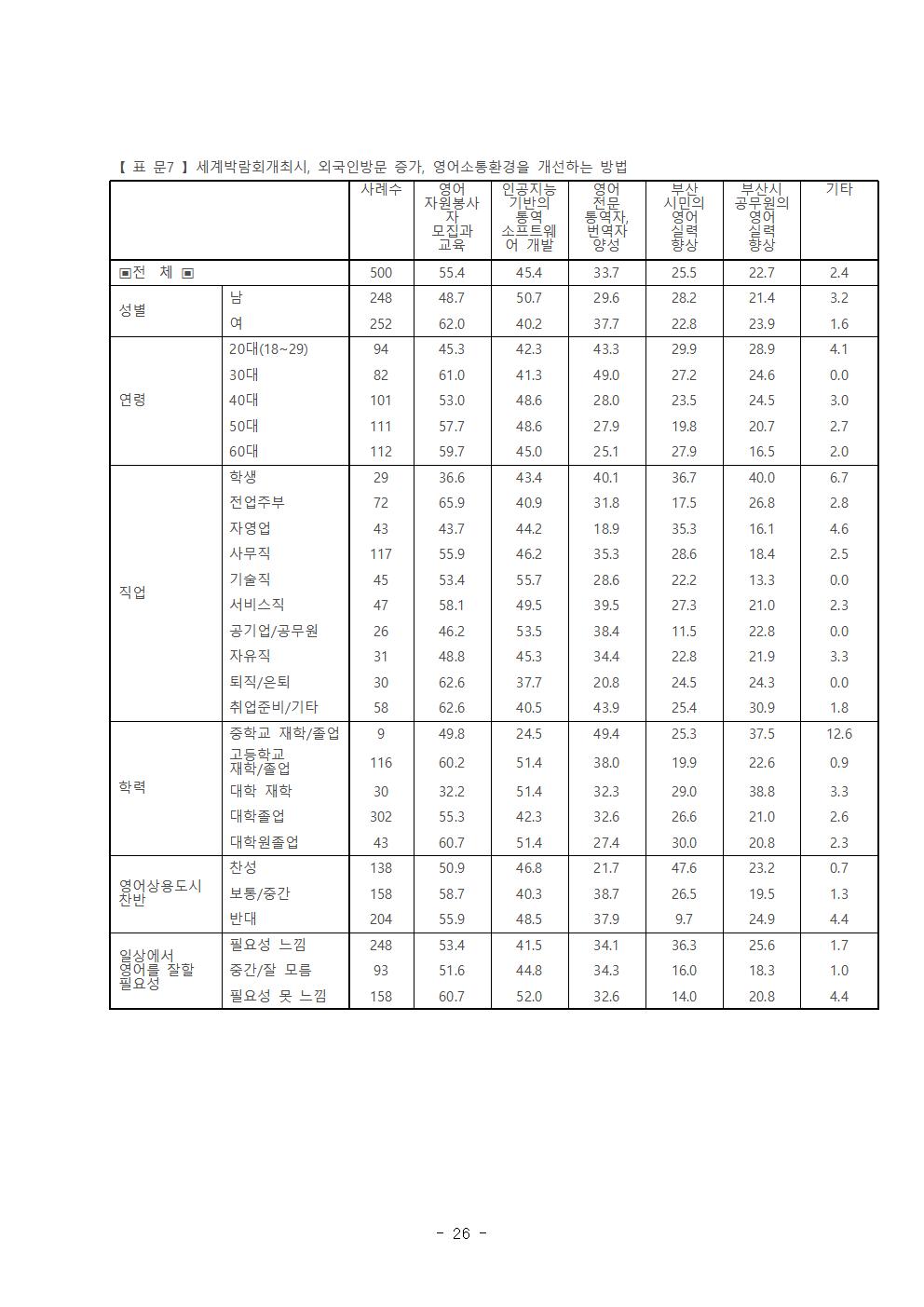 ‘영어 봉사자 모집과 교육’ 55.4%, ‘인공지능 기반의 통역 소프트웨어 개발’ 45.4%, ‘영어 전문 통역자, 번역자 양성’ 33.7% 순으로 나타나 국제적 행사에서 영어 소통을 원활하게 지원하는 것은 ‘전문분야 지원 및 전문가양성’이 우선이라고 보았다. ‘시민의 영어 실력 향상’이라고 답한 비율은 25.5%에 불과하여, 부산시의 정책 목표와 시민들의 호응 가능성 사이에 엄청난 차이가 있음을 보여주었다.