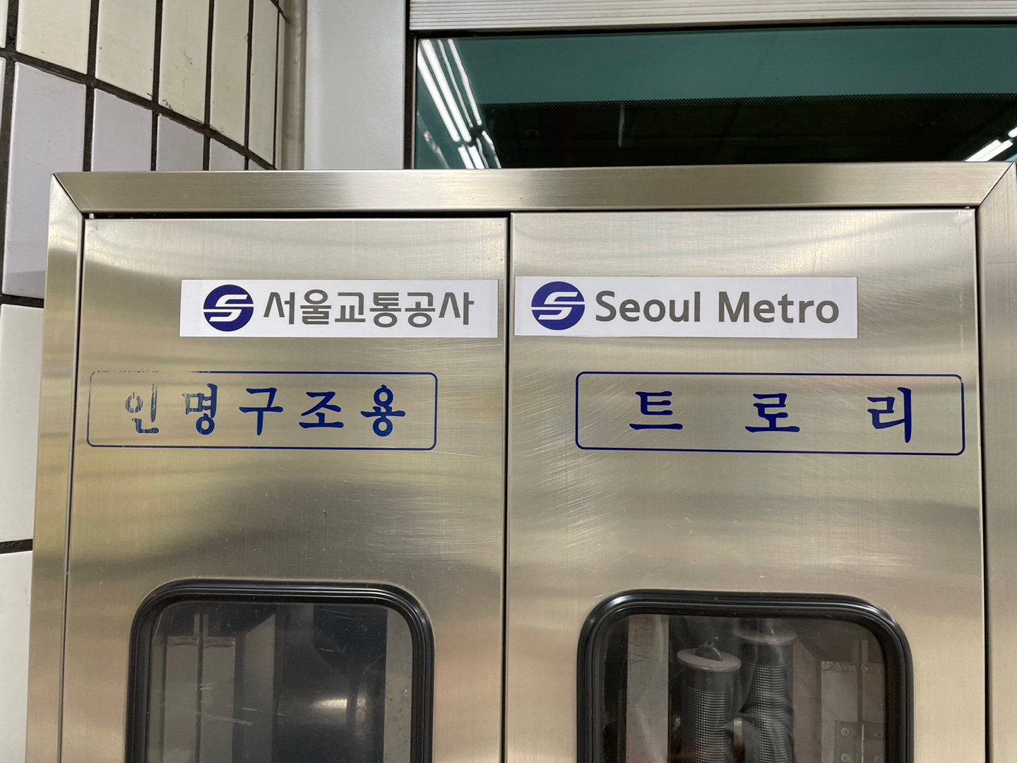 첫 번째 표지는 ‘인명구조용 트로리’인데, 단번에 이해하기가 힘들어 검색의 도움을 빌린 단어다. 지하철역 안의 ‘트로리’는 선로보수장비를 이르는 말로, 선로 위에 올리는 것과 선로 밖으로 빼내는 것이 모두 가능한 장비다. 평소 일반 대중이 사용할 일이 거의 없는 용어와 물건이나, ‘인명구조용’이라는 말에서 알 수 있듯 사람을 구하기 위해 사용될 물건인 만큼 되도록 이해하기 쉬운 단어로 바꿀 필요가 있다. 이는 ‘궤도자전차’, ‘궤도자동차’ 등의 단어로 수정 수 있는데, 여전히 어려운 한자어임에도 ‘궤도’, ‘차’ 등의 단어를 통해 시민들이 이 ‘트로리’를 자동심장충격기로 오해할 일은 없을 것이다.