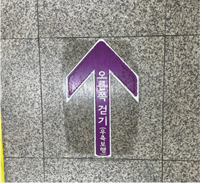좋은 예시를 지하철역 환승 통로 바닥에서 발견할 수 있었다. 화살표 안에 큰 글씨로 적힌 ‘오른쪽 걷기’는 쉬우면서도 표지판이 전달하고자 하는 바를 충실하게 전달한다. 게다가 ‘오른쪽 걷기’보다 ‘우측보행’이 익숙할 시민들을 위해 두 용어를 모두 써놓는 섬세함도 보였다. 이렇게 쉬운 말을 쓴 표지판이 좋은 이유는 문화적 측면에서도 찾을 수 있다. ‘오른쪽 걷기’ 표지판이 한국인보다 외국인에게 도움이 된다는 점이 그 근거다. 우리나라는 2010년부터 전국적으로 보행자와 자동차 우측통행을 실시했다. 따라서 굳이 오른쪽 걷기를 알리는 표지판이 없어도 통행에 혼선이 생길 가능성이 낮다. 그러나 영국, 일본 등 좌측통행이 원칙인 국가들이 존재하며 문화 차이로 인해 외국인들은 우리나라에서 위와 같은 표지판을 참고할 가능성이 높다. 한글을 전혀 읽지 못하는 외국인이라면 둘 중 어느 단어가 적혀 있더라도 큰 영향이 없겠지만, 우리말을 배우고 있는 외국인에게는 어려운 한자어인 ‘우측보행’보다 ‘오른쪽 걷기’가 더 쉽게 다가올 것이다.