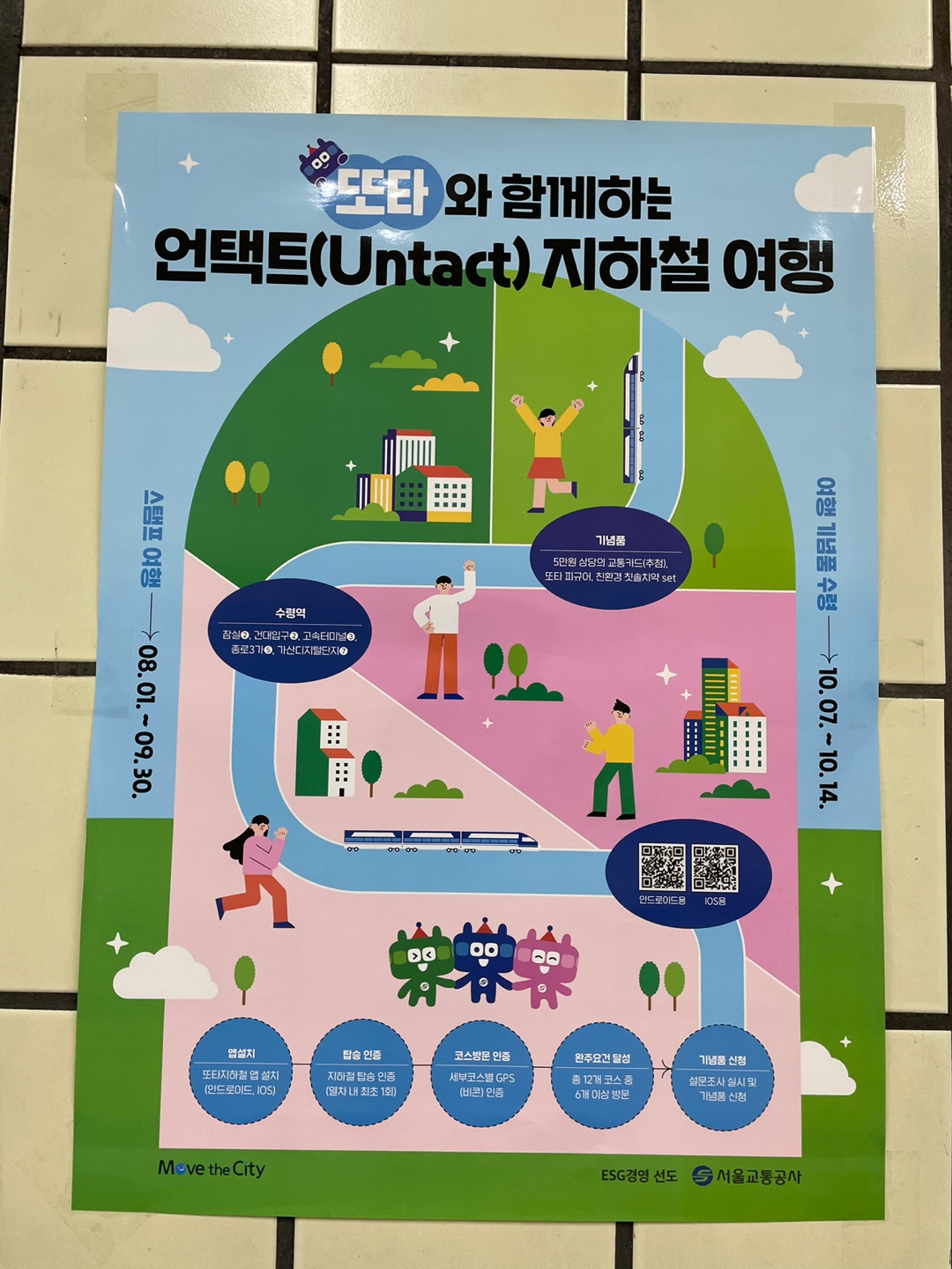 또 다른 예시는 서울교통공사 홍보지에서 발견할 수 있었다. ‘언택트(Untact) 지하철 여행’의 ‘언택트’는 접촉을 의미하는 ‘택트(contact)’에 부정을 의미하는 ‘언(un)’을 붙인 신조어로, 코로나19로 인한 사회적 거리두기가 확산됨에 따라 ‘비대면’을 의미하는 단어로 사용되고 있다. 시의적절한 단어라고 생각할 수도 있지만, ‘언택트’가 문제인 이유는 이 단어를 대체할 수 있는 단어가 존재하기 때문이다. ‘비대면’, ‘비접촉’은 영어 단어를 모르는 어르신이나 아이들도 쉽게 이해할 수 있다. 혹은 ‘거리두기’라는 순우리말을 사용해도 무방할 것이다. 최근 외국어 남용의 문제점이 지적받으며 불필요한 외국어의 사용이 감소하는 추세긴 하지만 여전히 우리 주변에서 불필요한 외국어가 많이 발견된다. 그렇다면 어떻게 경고의 기능을 수행하면서 우리말도 지키는 표지판을 만들 수 있을까?