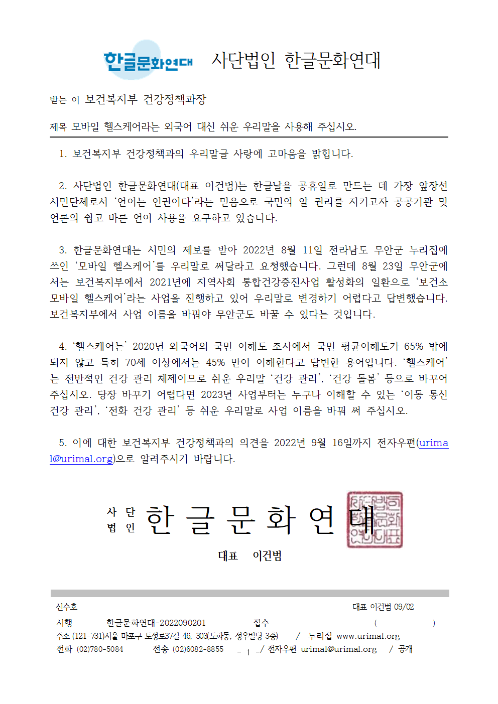 3. 한글문화연대는 시민의 제보를 받아 2022년 8월 11일 전라남도 무안군 누리집에 쓰인 ‘모바일 헬스케어’를 우리말로 써달라고 요청했습니다. 그런데 8월 23일 무안군에서는 보건복지부에서 2021년에 지역사회 통합건강증진사업 활성화의 일환으로 ‘보건소 모바일 헬스케어’라는 사업을 진행하고 있어 우리말로 변경하기 어렵다고 답변했습니다. 보건복지부에서 사업 이름을 바꿔야 무안군도 바꿀 수 있다는 것입니다.