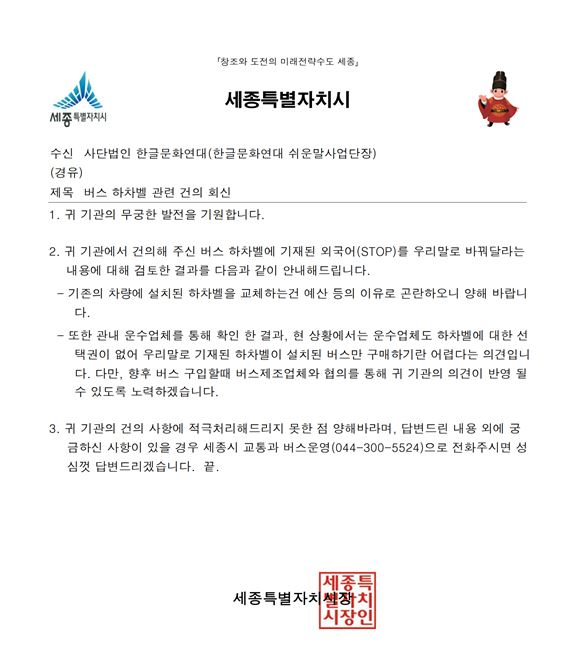 | [공문] 버스 하차벨 STOP이라는 외국어를 우리말로 바꿔 주십시오. 세종특별자치시 교통과 - 2022.09.23 (0) | 2022.12.09 |