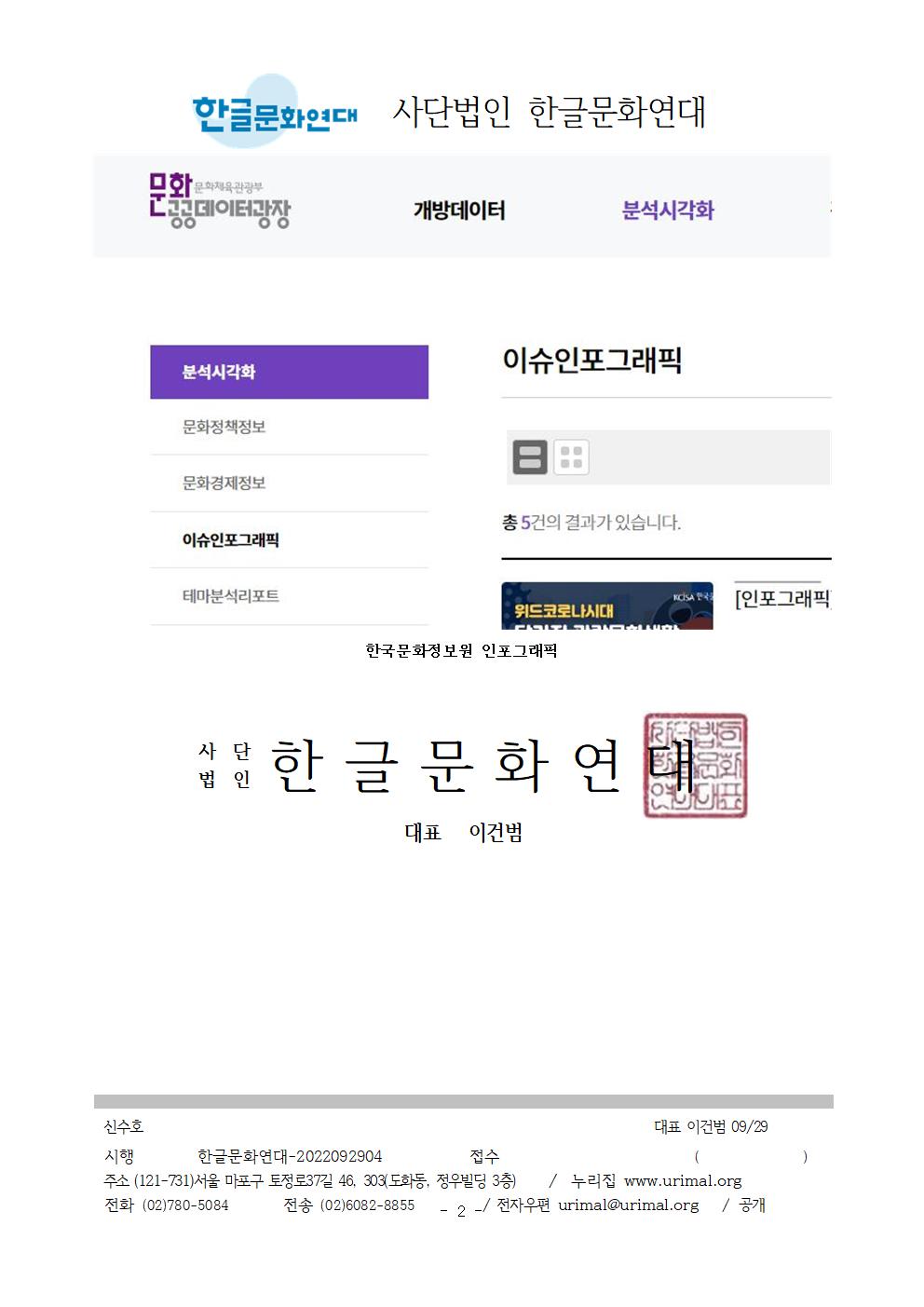 4. 이에 대한 한국문화정보원의 의견을 2022년 10월 14일까지 서면(urimal@urimal.org)으로 알려주시기 바랍니다. 고맙습니다.