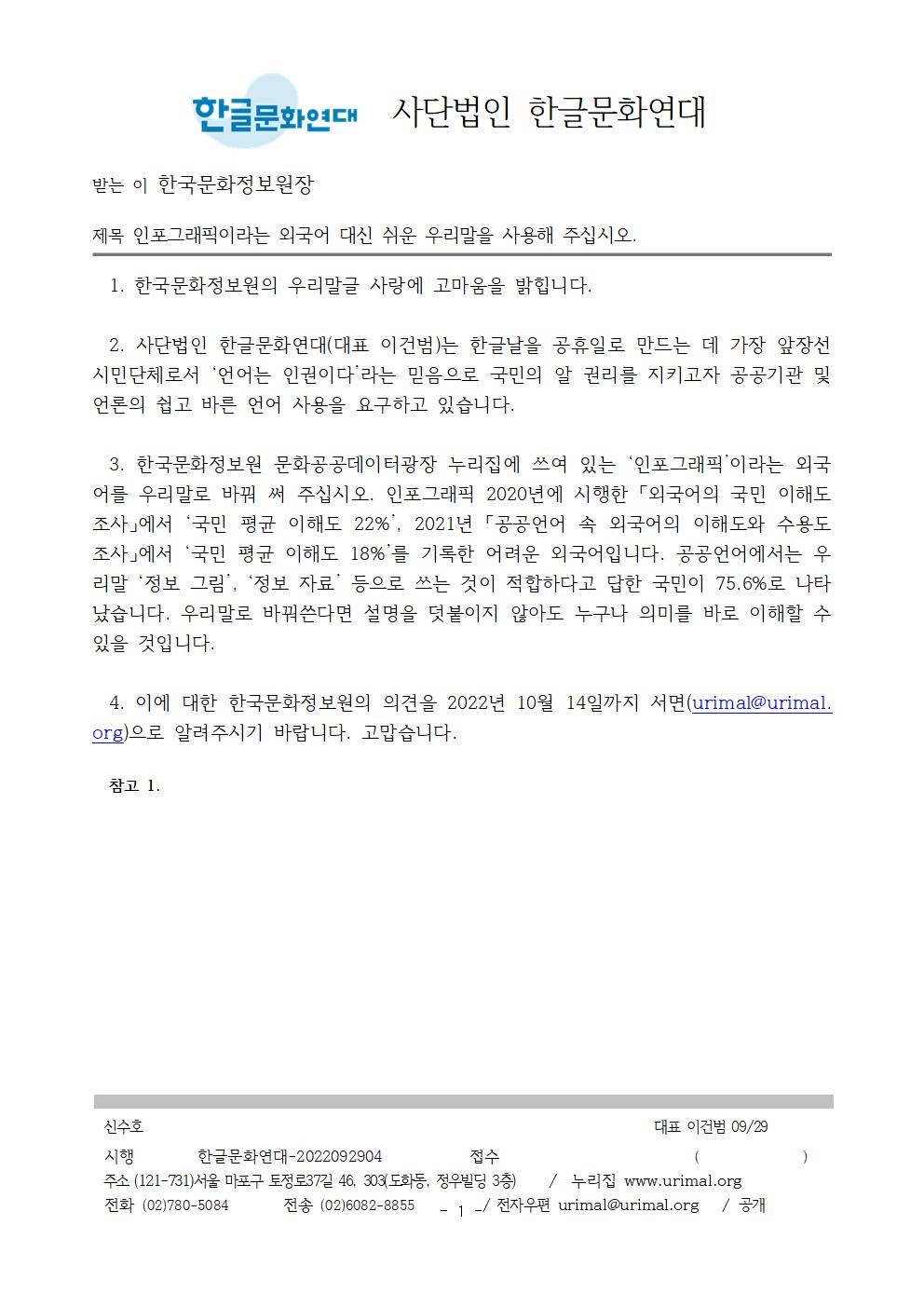 | [공문/답변] 인포그래픽이라는 외국어 대신 쉬운 우리말을 사용해 주십시오. 한국문화정보원 - 2022.10.24 (0) | 2022.12.09 |