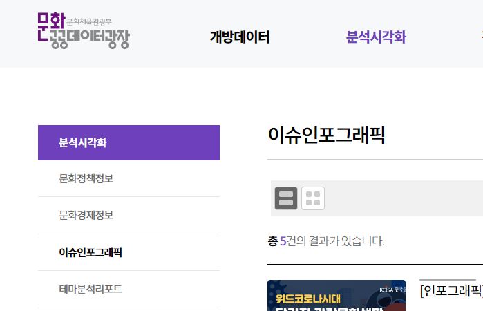 3. 한국문화정보원 문화공공데이터광장 누리집에 쓰여 있는 ‘인포그래픽’이라는 외국어를 우리말로 바꿔 써 주십시오. 인포그래픽 2020년에 시행한 「외국어의 국민 이해도 조사」에서 ‘국민 평균 이해도 22%’, 2021년 「공공언어 속 외국어의 이해도와 수용도 조사」에서 ‘국민 평균 이해도 18%’를 기록한 어려운 외국어입니다. 공공언어에서는 우리말 ‘정보 그림’, ‘정보 자료’ 등으로 쓰는 것이 적합하다고 답한 국민이 75.6%로 나타났습니다. 우리말로 바꿔쓴다면 설명을 덧붙이지 않아도 누구나 의미를 바로 이해할 수 있을 것입니다.