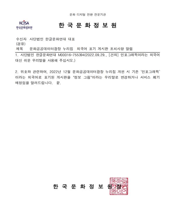 1. 사단법인 한글문화연대 M00016-755394(2022.09.29., [건의] 인포그래픽이라는 외국어 대신 쉬운 우리말을 사용해 주십시오.)