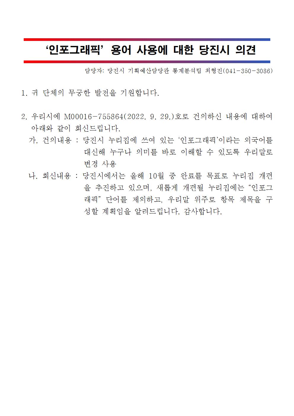 가. 건의내용 : 당진시 누리집에 쓰여 있는 ‘인포그래픽’이라는 외국어를 대신해 누구나 의미를 바로 이해할 수 있도록 우리말로 변경 사용