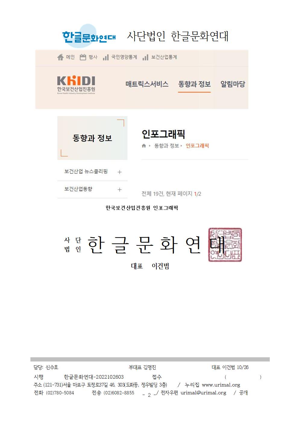| [공문/답변] 인포그래픽이라는 외국어 대신 쉬운 우리말을 사용해 주십시오. 한국보건산업진흥원 - 2022.11.14 (1) | 2022.12.09 |