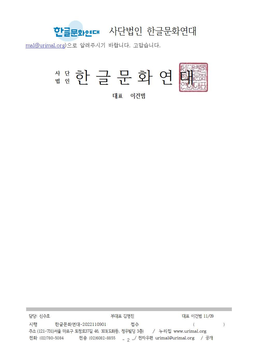 2. 사단법인 한글문화연대(대표 이건범)는 한글날을 공휴일로 만드는 데 가장 앞장선 시민단체로서 언어는 인권이다라는 믿음으로 국민의 알 권리를 지키고자 공공기관 및 언론의 쉽고 바른 언어 사용을 요청하고 있습니다.