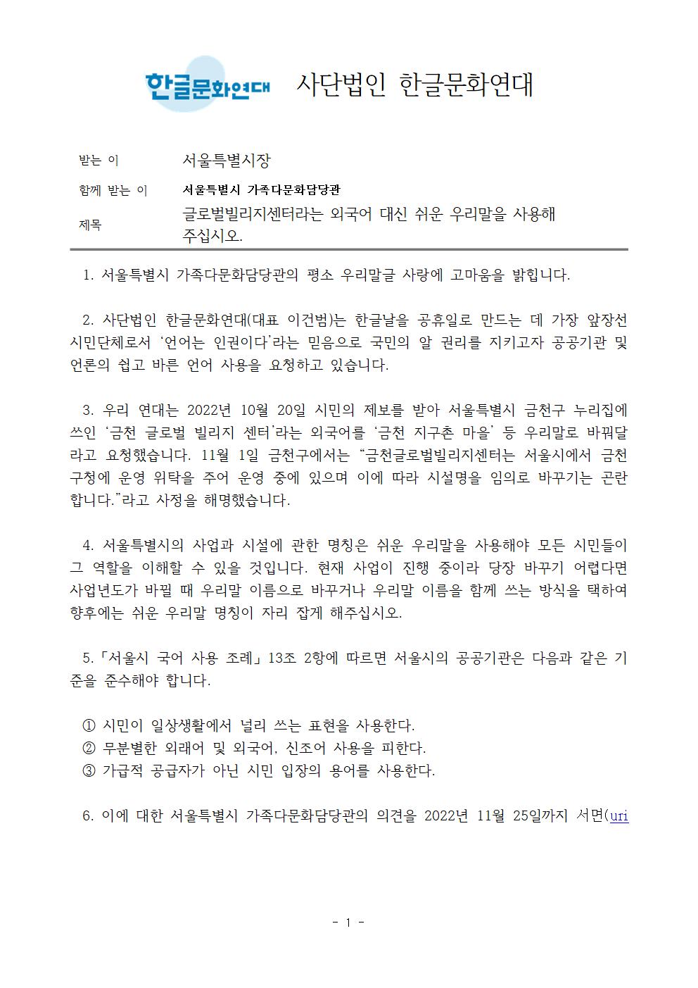 3. 우리 연대는 2022년 10월 20일 시민의 제보를 받아 서울특별시 금천구 누리집에 쓰인 ‘금천 글로벌 빌리지 센터’라는 외국어를 ‘금천 지구촌 마을’ 등 우리말로 바꿔달라고 요청했습니다. 11월 1일 금천구에서는 “금천글로벌빌리지센터는 서울시에서 금천구청에 운영 위탁을 주어 운영 중에 있으며 이에 따라 시설명을 임의로 바꾸기는 곤란합니다.”라고 사정을 해명했습니다.