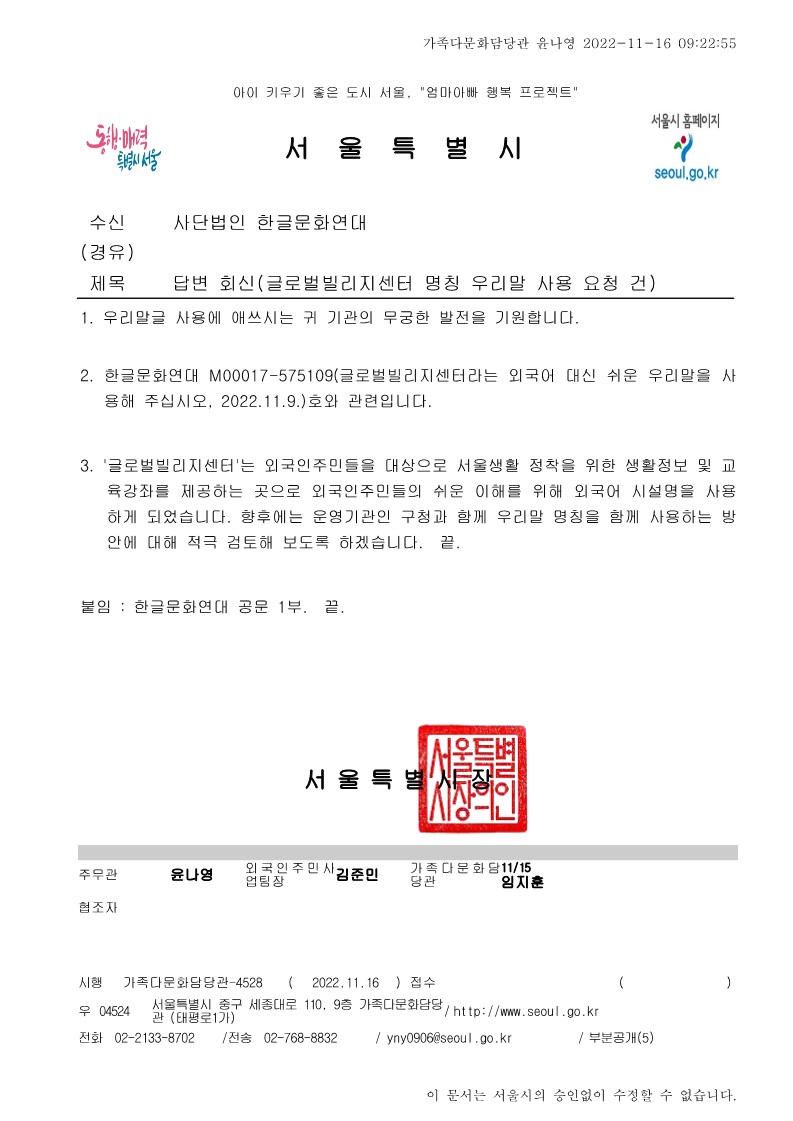 3. '글로벌빌리지센터'는 외국인주민들을 대상으로 서울생활 정착을 위한 생활정보 및 교육강좌를 제공하는 곳으로 외국인주민들의 쉬운 이해를 위해 외국어 시설명을 사용하게 되었습니다. 향후에는 운영기관인 구청과 함께 우리말 명칭을 함께 사용하는 방안에 대해 적극 검토해 보도록 하겠습니다. 끝.