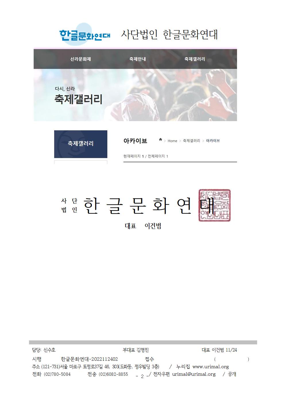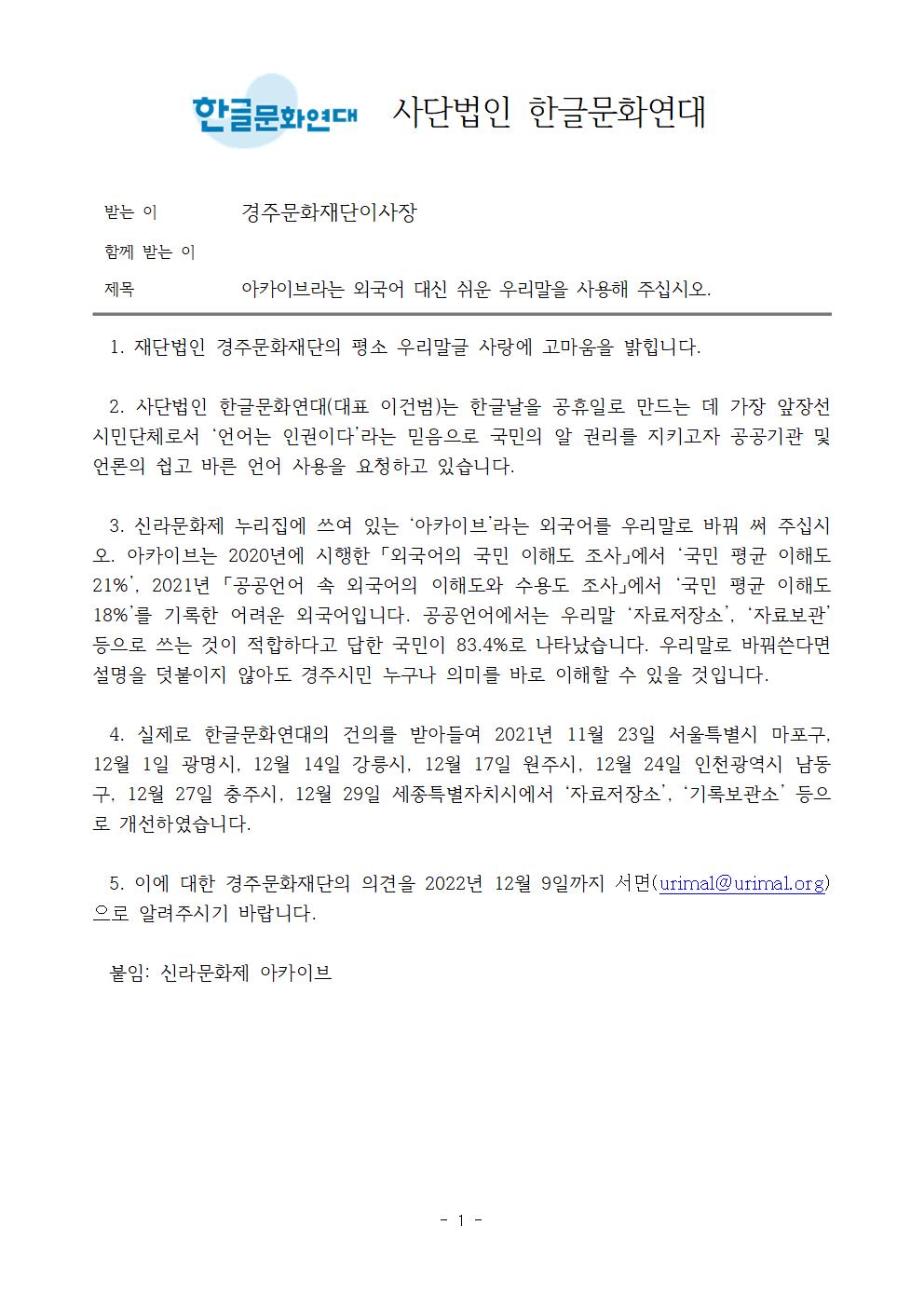 5. 이에 대한 경주문화재단의 의견을 2022년 12월 9일까지 서면(urimal@urimal.org)으로 알려주시기 바랍니다.