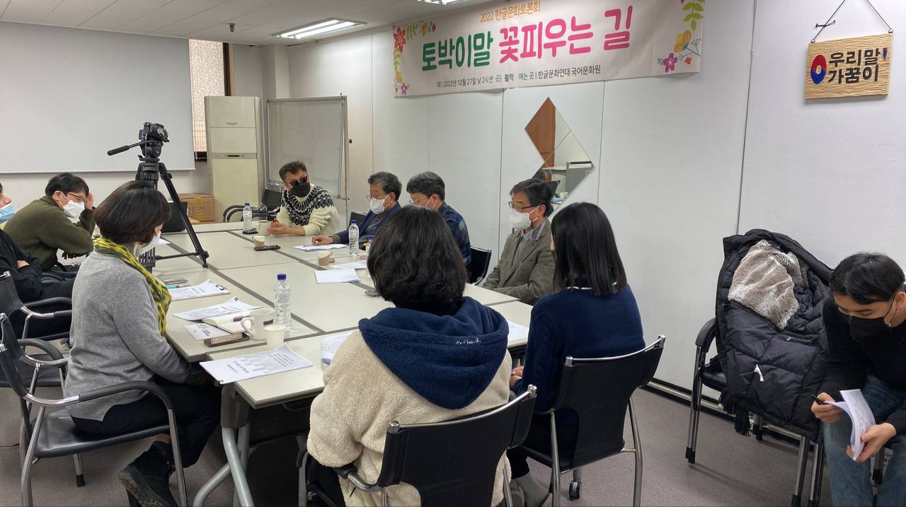 2022년 12월 28일 오후 2시 반부터 5시 반까지 한글문화연대는 <토박이말 꽃피우는 길>이라는 주제로 2022 한글문화토론회를 열었습니다. 토론회에는 총 11명이 참가했습니다.