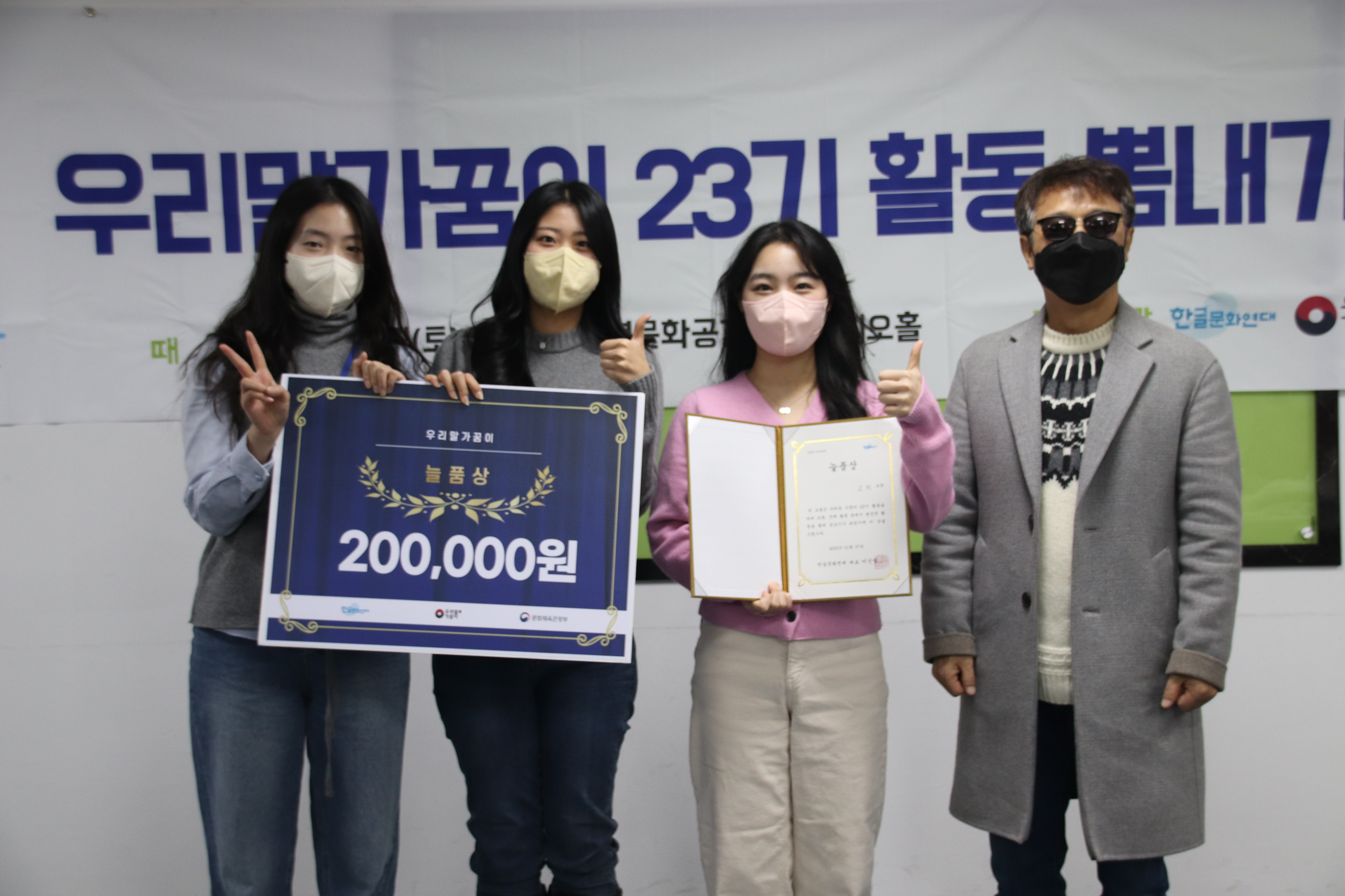 으뜸으로 활동한 가꿈이에게는 문화체육관광부 장관상이 수여됐으며, 모둠상으로는 늘품, 너울가지, 늘찬 모둠상 등의 시상과 함께 한글문화연대에서 후원하는 장학금 시상이 있었습니다.