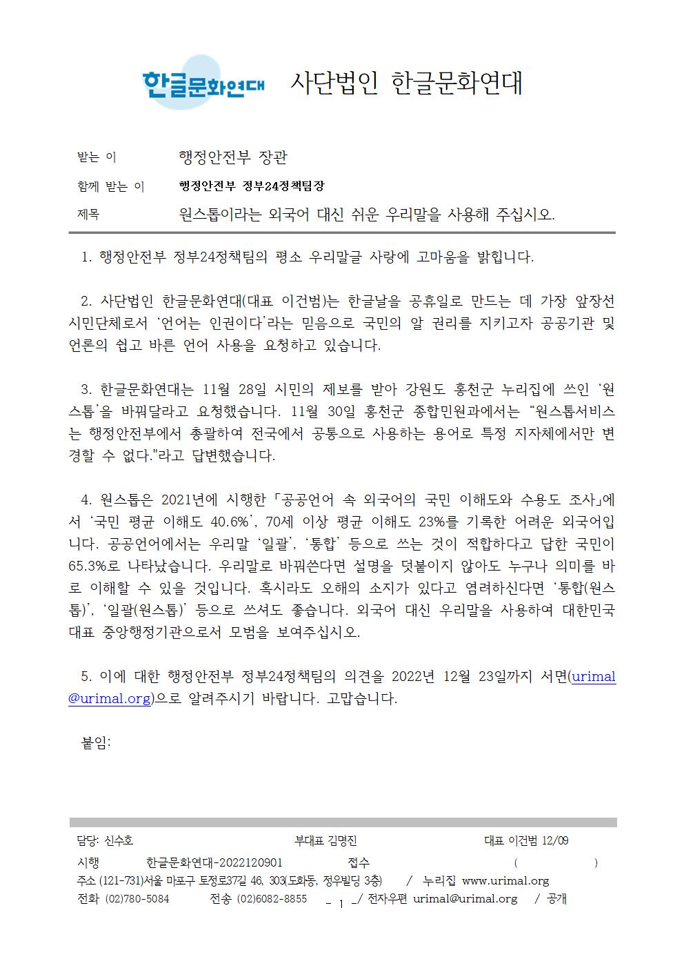 5. 이에 대한 행정안전부 정부24정책팀의 의견을 2022년 12월 23일까지 서면(urimal@urimal.org)으로 알려주시기 바랍니다. 고맙습니다.