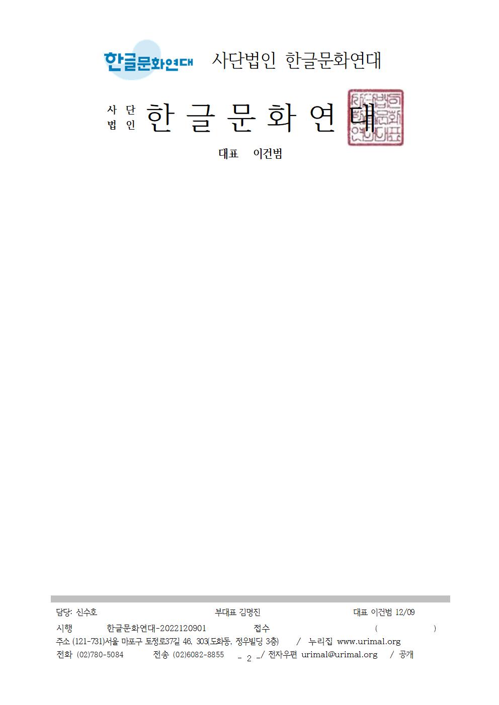 2. 사단법인 한글문화연대(대표 이건범)는 한글날을 공휴일로 만드는 데 가장 앞장선 시민단체로서 ‘언어는 인권이다’라는 믿음으로 국민의 알 권리를 지키고자 공공기관 및 언론의 쉽고 바른 언어 사용을 요청하고 있습니다.