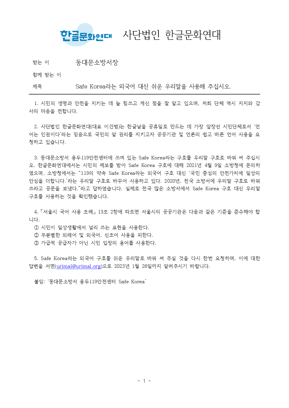 5. Safe Korea라는 외국어 구호를 쉬운 우리말로 바꿔 써 주실 것을 다시 한번 요청하며, 이에 대한 답변을 서면(urimal@urimal.org)으로 2023년 1월 26일까지 알려주시기 바랍니다.