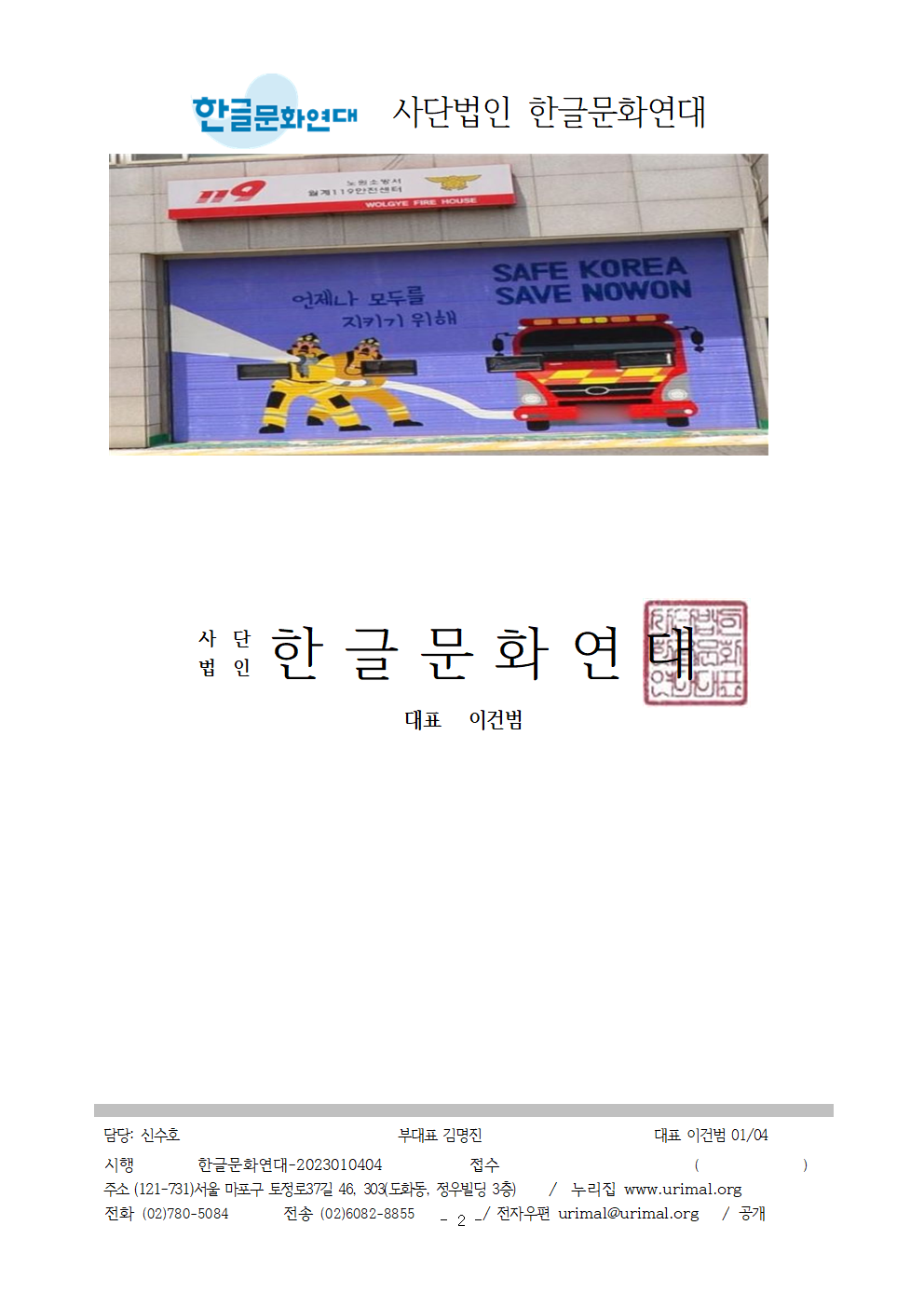 3. 노원소방서 월계119안전센터에 쓰여 있는 Safe Korea라는 구호를 우리말 구호로 바꿔 써 주십시오. 한글문화연대에서는 시민의 제보를 받아 Safe Korea 구호에 대해 2021년 4월 9일 소방청에 문의하였으며, 소방청에서는 “119의 약속 Safe Korea라는 외국어 구호 대신 ‘국민 중심의 안전가치에 일상의 안심을 더합니다.’라는 우리말 구호로 바꾸어 사용하고 있다. 2020년, 전국 소방서에 우리말 구호로 바꿔쓰라고 공문을 보냈다.”라고 답하였습니다. 실제로 전국 많은 소방서에서 Safe Korea 구호 대신 우리말 구호를 사용하는 것을 확인했습니다.