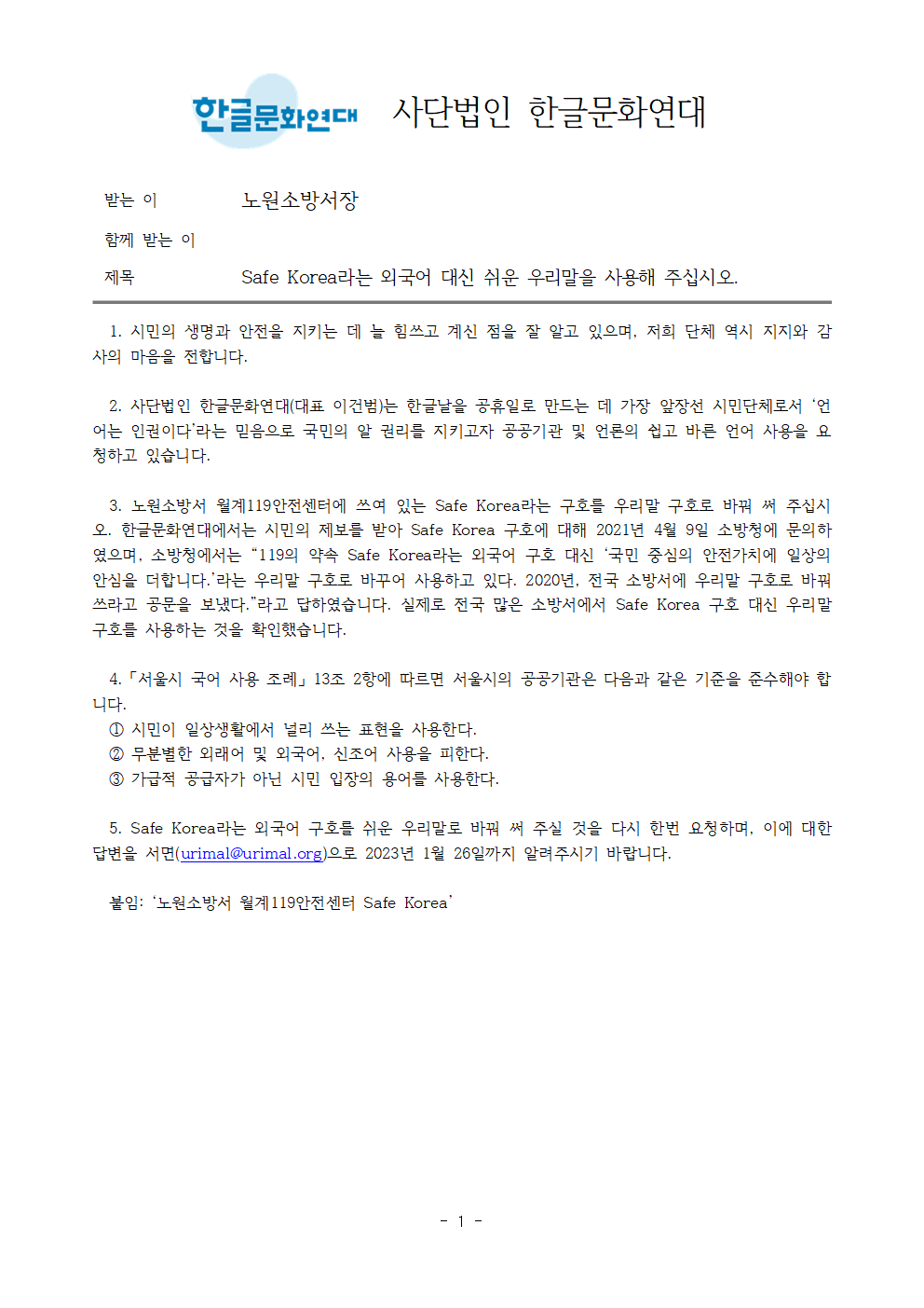 5. Safe Korea라는 외국어 구호를 쉬운 우리말로 바꿔 써 주실 것을 다시 한번 요청하며, 이에 대한 답변을 서면(urimal@urimal.org)으로 2023년 1월 26일까지 알려주시기 바랍니다.