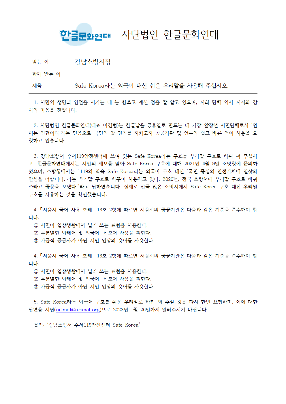 5. Safe Korea라는 외국어 구호를 쉬운 우리말로 바꿔 써 주실 것을 다시 한번 요청하며, 이에 대한 답변을 서면(urimal@urimal.org)으로 2023년 1월 26일까지 알려주시기 바랍니다.
