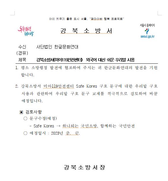 2. 강북소방서 미아119안전센터 Safe Korea 구호 문구에 대한 우리말 구호 사용과 관련하여 우리말 구호 문구 교체를 적극적으로 검토하여 바꿀 예정입니다.