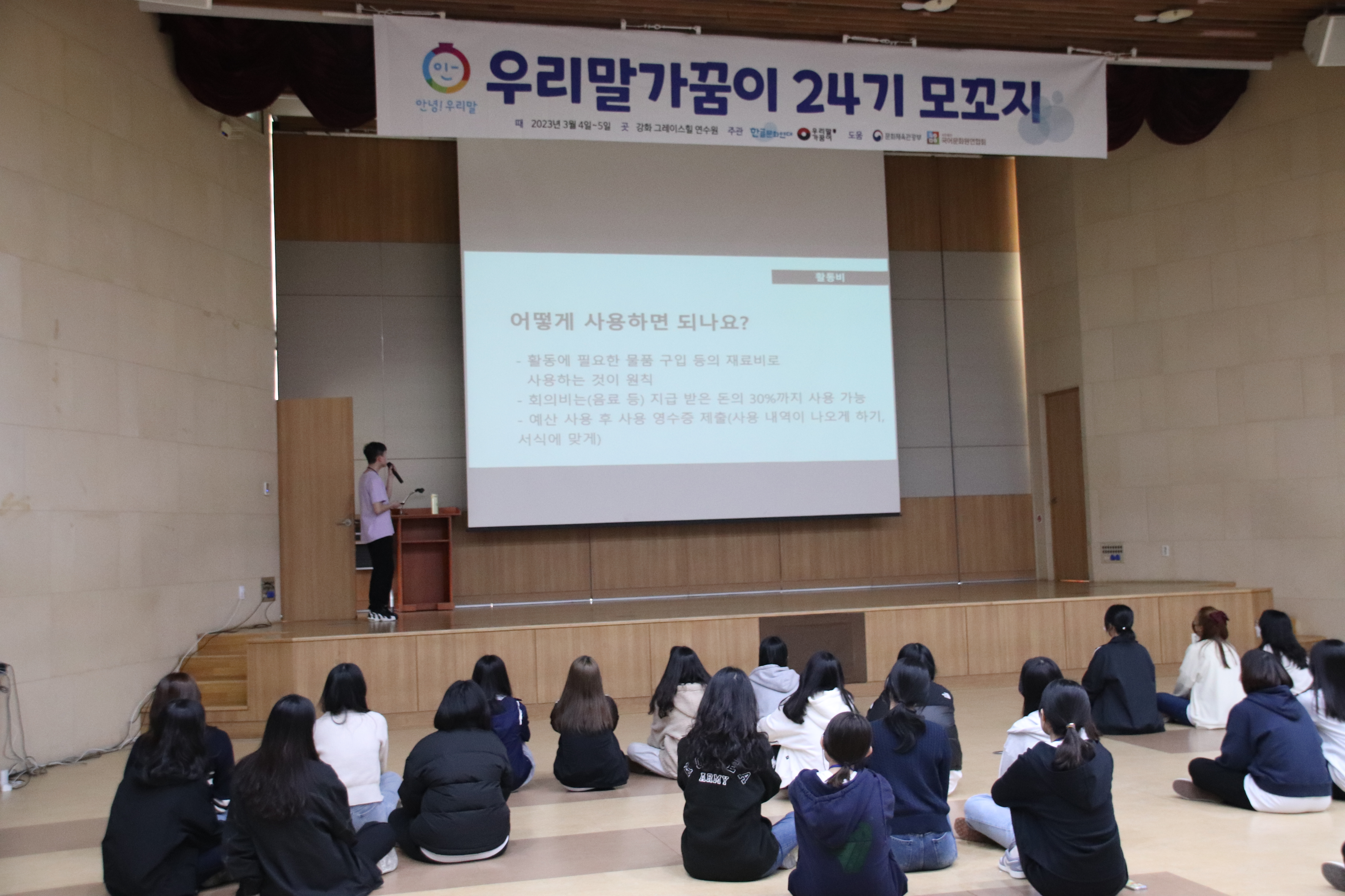2023년 3월 4일 토요일 아침 10시부터 3월 5일 일요일 아침 10시 30분까지 우리말가꿈이 24기 오름마당과 모꼬지를 진행했습니다. 서류와 비대면 화상 면접을 거쳐 '우리말가꿈이 24기'로 뽑힌 학생은 모두 61명입니다. 거리두기도 폐지되고 새 학기 시작에 맞추어 4년만에 모꼬지를 떠났습니다. 총 참석 인원은 46명이었으며, 불참한 분들은 개인 사정, 감기 몸살 등으로 인한 이유들로 아쉬움을 자아냈습니다.