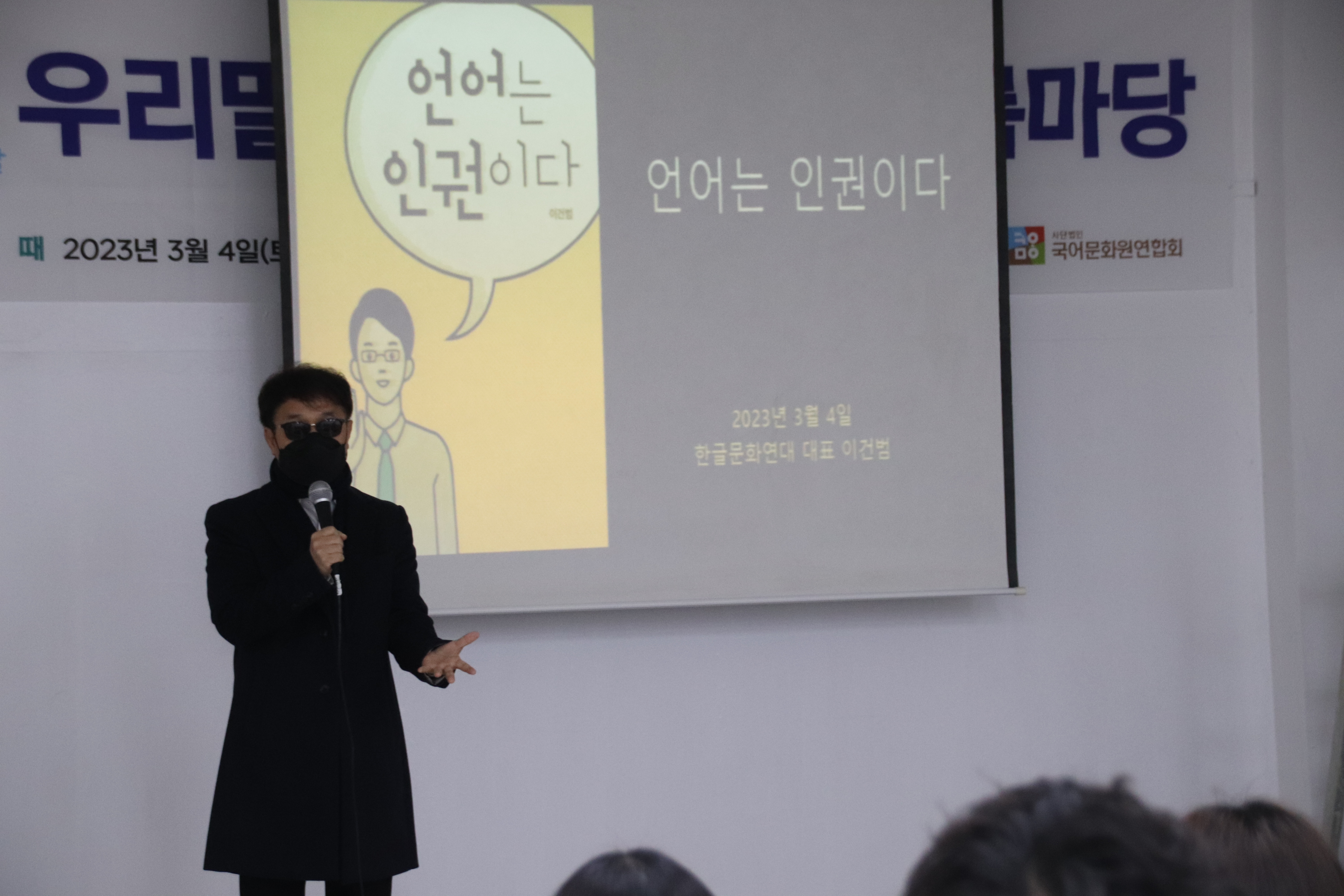 첫 번째로 이건범 한글문화연대 대표가 '언어는 인권이다'라는 주제로 우리말글 기본 소양교육과 더불어 강연을 진행했습니다. 한글과 한국어(우리말)의 차이 등 우리말가꿈이라면 알아야 할 지식들을 알기 쉽게 설명해주었습니다.