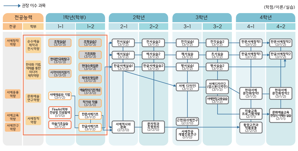 서예전공은 전통실기와 이론교육 그리고 현대화된 응용서예를 배운다. 1학년 때는 ‘Fine Arts학부’라는 학부 수업을 듣다가 2학년 때 본격적으로 서예 수업을 듣는다. 실습 위주로 과정을 살펴보면 2학년 때는 주로 전서와 예서 그리고 한글 서예를 배운다. 3학년은 전각, 해서, 행서를 쓰는 실습을 거친다. 4학년에는 한문과 한글로 나누어 서예창작 실습을 한다. 전반적으로 한자와 한글 서체를 쓰는 방법들을 배우고 서예에 관한 배경지식을 알아간다. 서예전공 트랙제는 서예 교육의 자체 제작물을 개발하는 서예교육자양성트랙과 서예의 현대적 활용과 범위를 확장시키는 서예콘텐츠개발트랙이 있다. 트랙제는 일반 전공 내에서 특정분야의 전문 인력을 양성하기 위하여 교육하는 체계를 말한다.